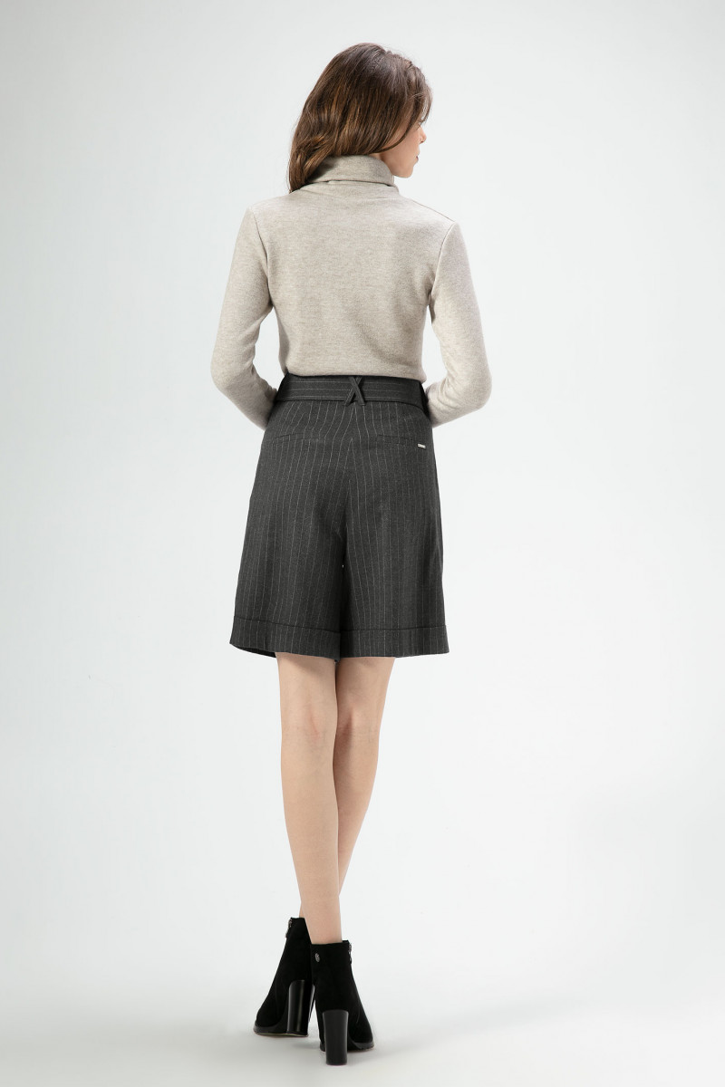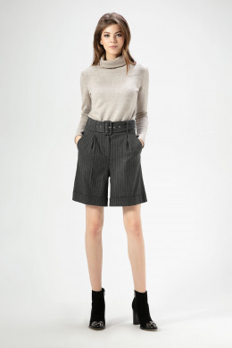 Стильные шорты из вискозной ткани с изящным рисунком в полоску. Шорты классические, на талии, удлиненные, что позволяет надеть в офис в сочетании с жакетом как дресс-код. Шорты на талии, по переду две глубокие складки, по бокам карманы. На задних частях шорт имитация карманов. Низ шорт оформлен отложными широкими манжетами. Шорты дополнены широким поясом из основной ткани.