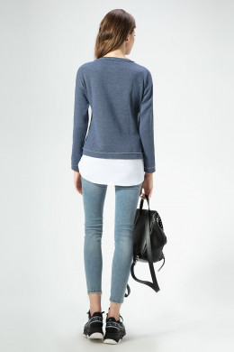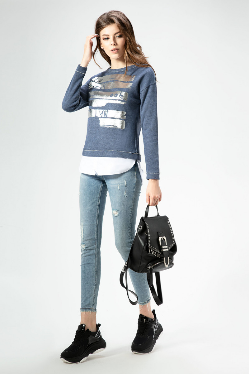 Практичный эффектный джемпер из приятного хлопкового трикотажа выполнен в стиле спорт-шик.Рукав длинный с притачным манжетом по низу.Вырез горловины округлой формы также с притачной планкой по краю,Снизу изделия выполнена притачная планка и имитация рубашки ,одетой снизу.По переду нанесён графический принт фольгой. Прекрасный вариант джемпера на каждый день,который позволяет выглядеть презентабельно и стильно и при этом изделие максимально комфортно и приятно к телу.