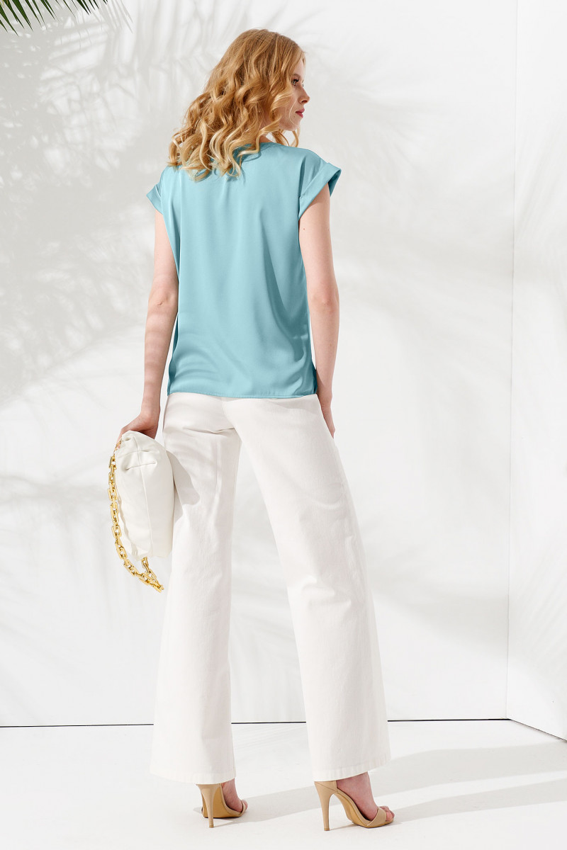 Блузка женская в офис имеет неформальный вид, в отличие от традиционной одежды в деловом стиле. Проймы рукавов украшены отложными манжетами. Лаконичный дизайн позволяет носить различные аксессуары, жакеты и пиджаки, тем самым меняя повседневные образы.