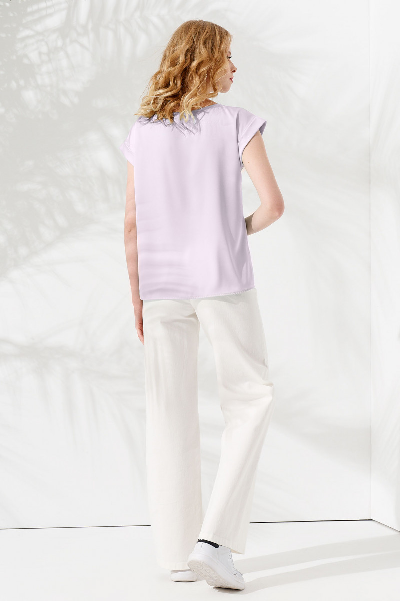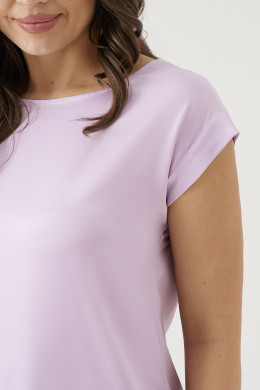 Блузка женская с коротким рукавом выглядит изящно благодаря мягкой ткани с характерным блеском. Она изготовлена из полиэстера и эластана - износоустойчивой и приятной на ощупь ткани, которая легко тянется и хорошо пропускает воздух. Блузка с коротким рукавом, вырезом горловины «лодочка» и аккуратно обработанным низом выполнена в прямом фасоне.
