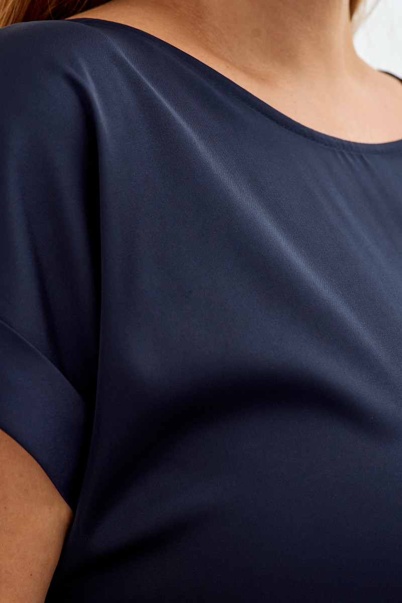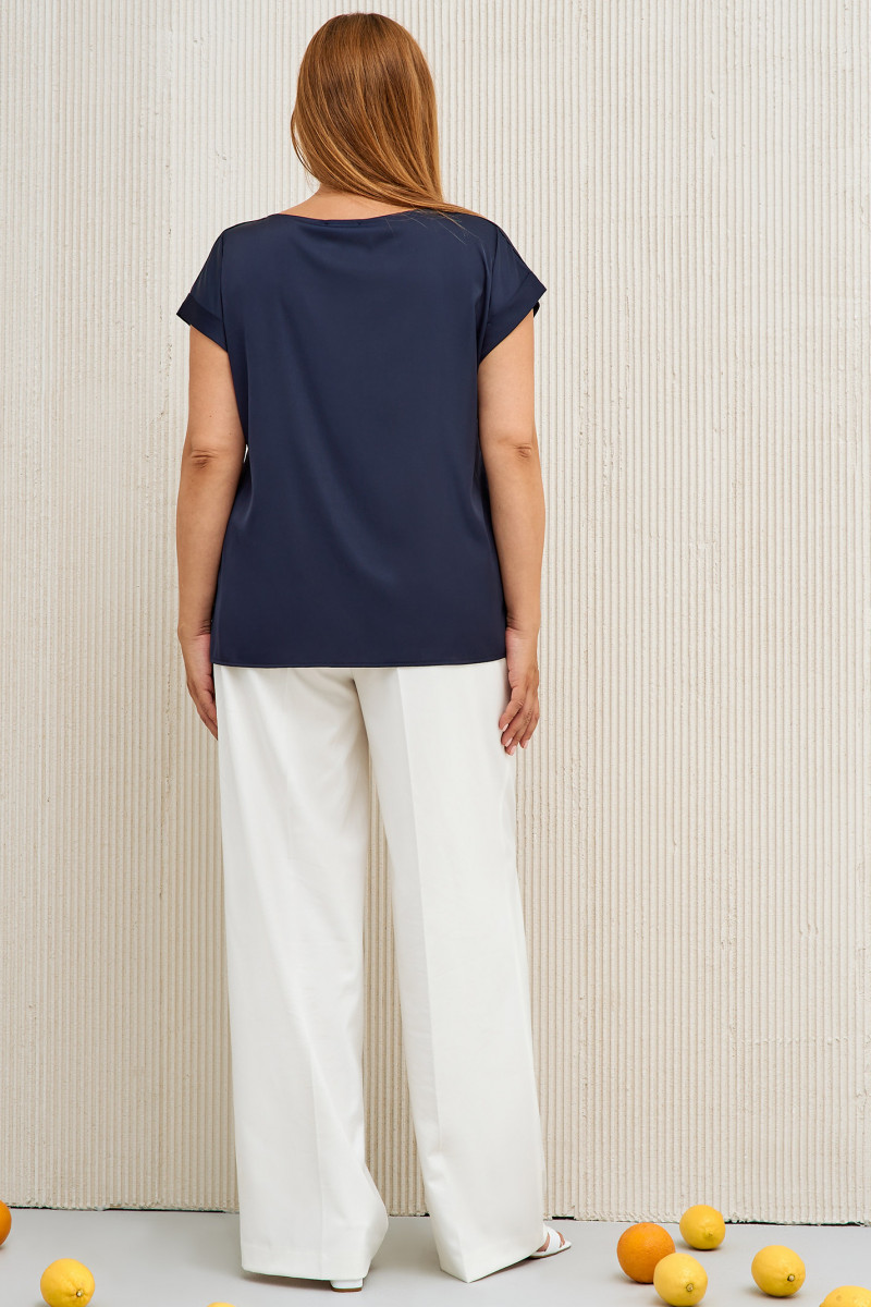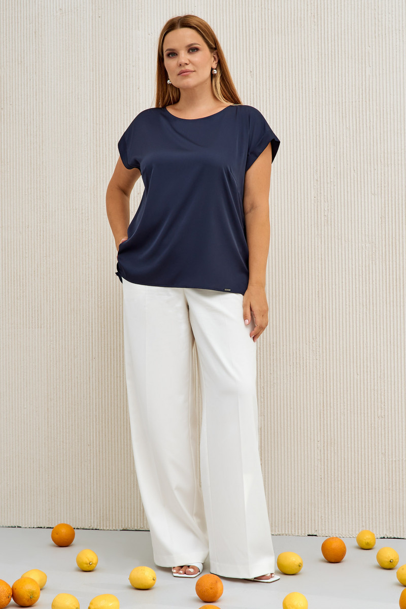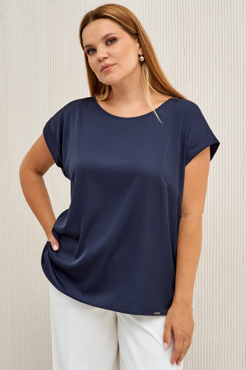 Лаконичная базовая блузка из тонкой струящейся ткани с небольшим блеском. Блузка полуприлегающего силуэта с круглым вырезом горловины, с нагрудными вытачками. Горловина обработана внутренней окантовкой. Проймы блузки обработаны декоративными отложными манжетами. Такая универсальная базовая блузка станет неотъемлемым дополнением вашего гардероба.
