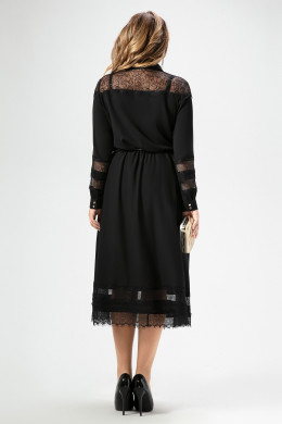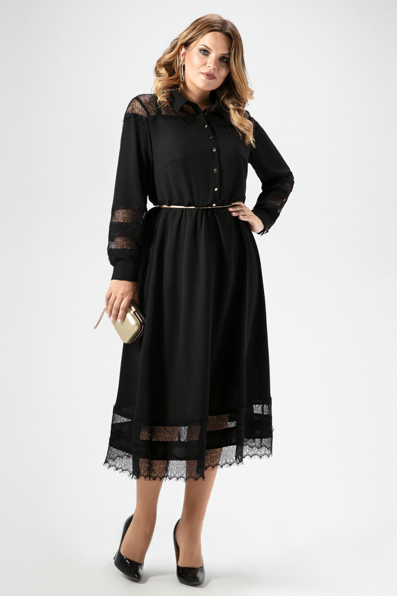 Нарядное платье из струящиеся шифоновой ткани. Платье удлиненное, с длинными рукавами на манжете, с воротником, с застежкой на планке на петли и пуговицы. Платье отрезное по талии. Нижняя часть платья на подкладки из вискозной ткани. Платье дополнено изящным французским кружевом и съёмным декоративным поясом. Стильное модное платье отлично подойдет для торжественных случаев.