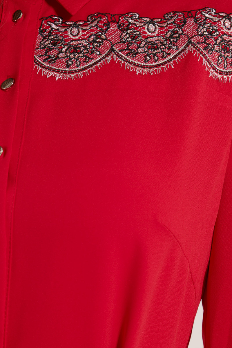 Стильное платье полуприлегающего силуэта, с центральной планкой на петли пуговицы, с отрезной кокеткой декорированной вышивкой кружево, с нагрудными вытачками. Спинка с кокеткой и складками от нее. Рукава 7/8 книзу со сборкой и притачной манжетой. Отличный вариант для торжества и на каждый день.