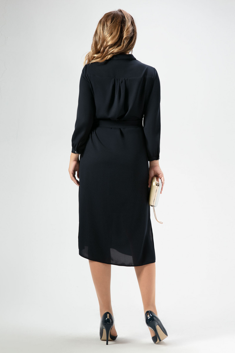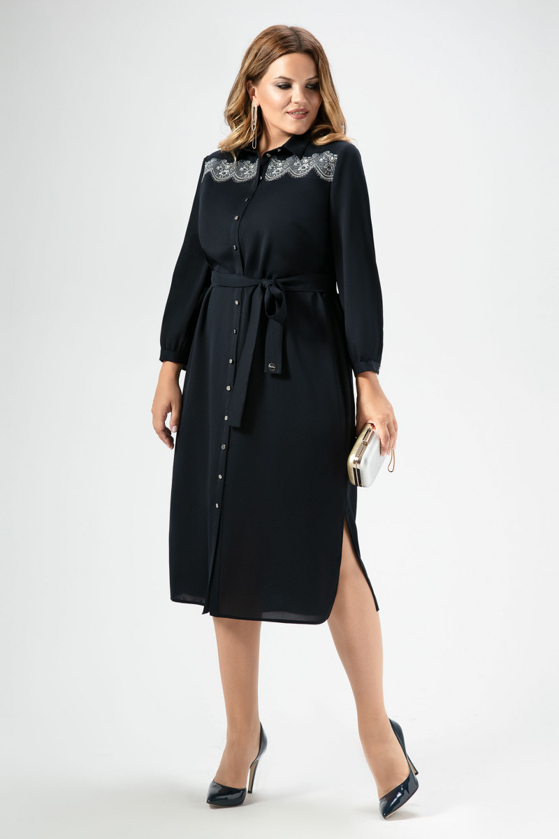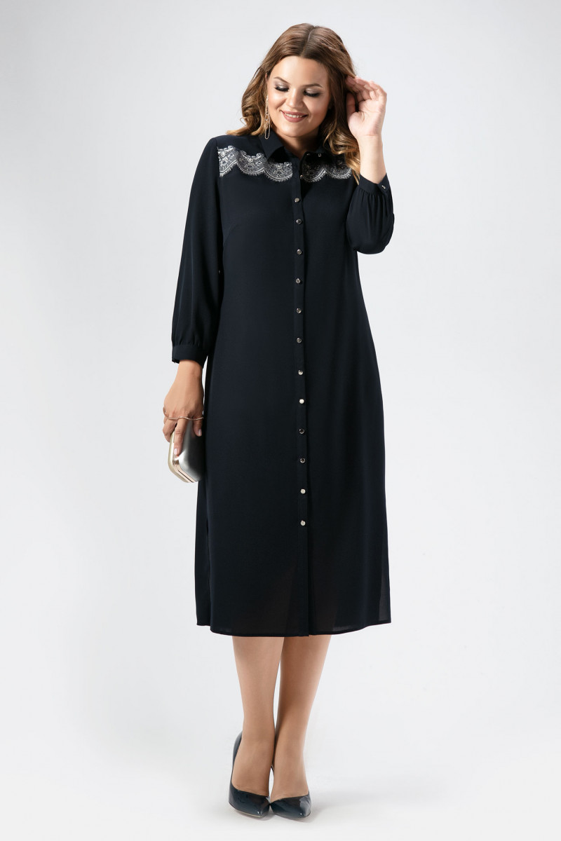 Стильное платье полуприлегающего силуэта, с центральной планкой на петли пуговицы, с отрезной кокеткой декорированной вышивкой кружево, с нагрудными вытачками. Спинка с кокеткой и складками от нее. Рукава 7/8 книзу со сборкой и притачной манжетой. Отличный вариант для торжества и на каждый день.