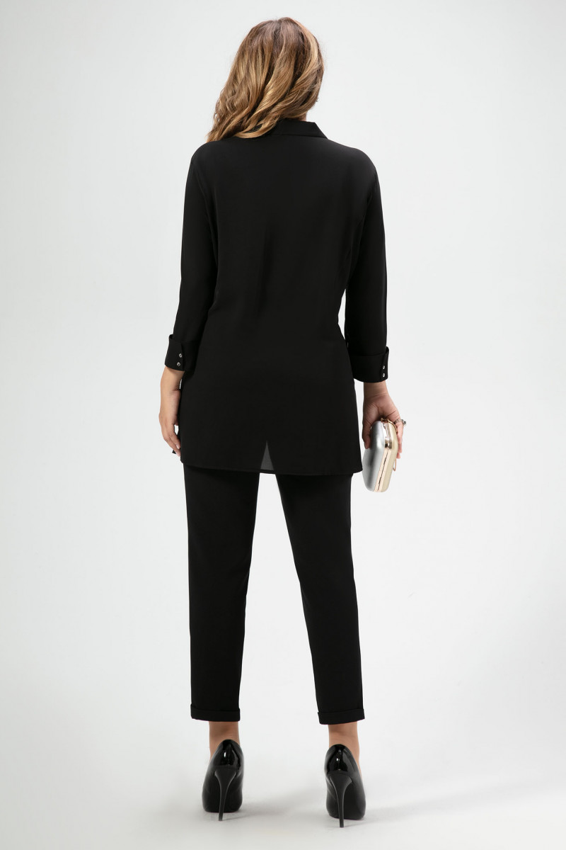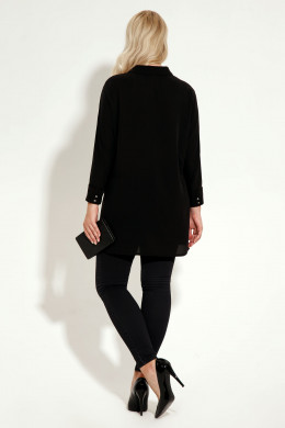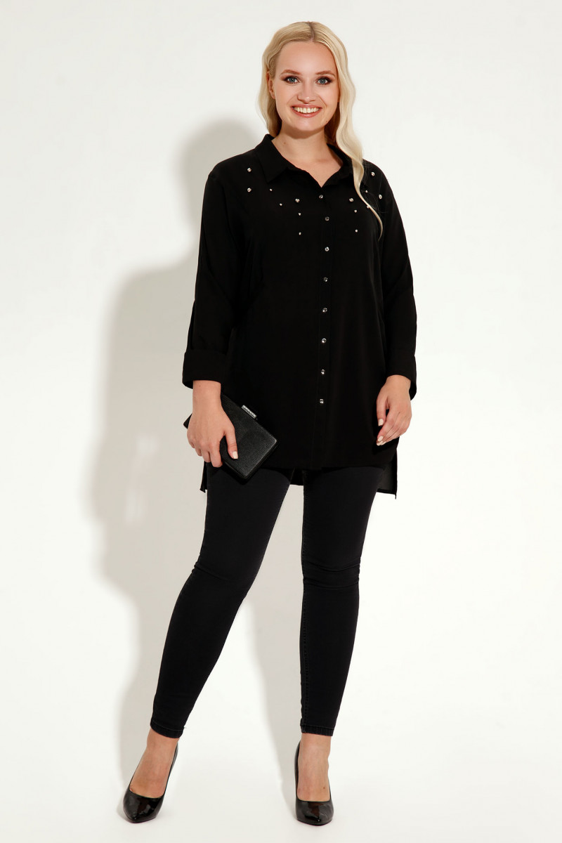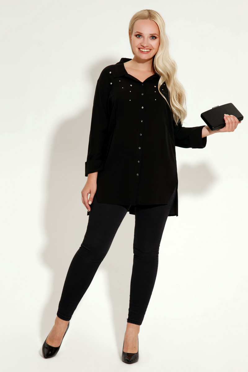 Стильная блузка из шифона, свободного силуэта, с центральной планкой на петли пуговицы, с фигурными рельефами, акцент сделан на металлические бусинки, линия низа фигурной формы. Спинка с фигурными рельефами. Рукава 7/8 с манжетами. Новый тренд в одежде " девушка в черном" стал частью такого понятия как сексуальность, грациозность. Создать стильный, свободный образ помогут яркие аксессуары.