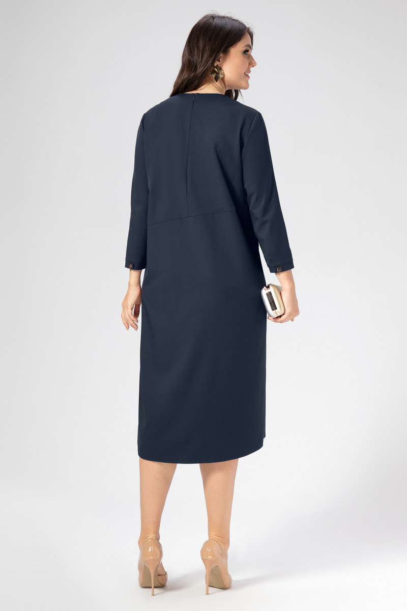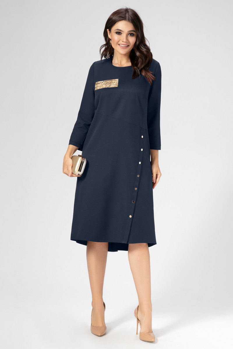 Стильное и элегантное эффектное платье трапецевидного силуэта декорированное золотой фурнитурой и принтом. Ткань мягкая и немнущаяся,очень лёгкая в уходе и практичная при эксплуатации.Вырез горловины круглый.Длина рукава 3/4 с тонким отрезным манжетом и декоративной кнопкой .По спинке и по переду лиф отрезной по косой линии выше талии. Застёжка на спинке от горловины на потайную молнию.
