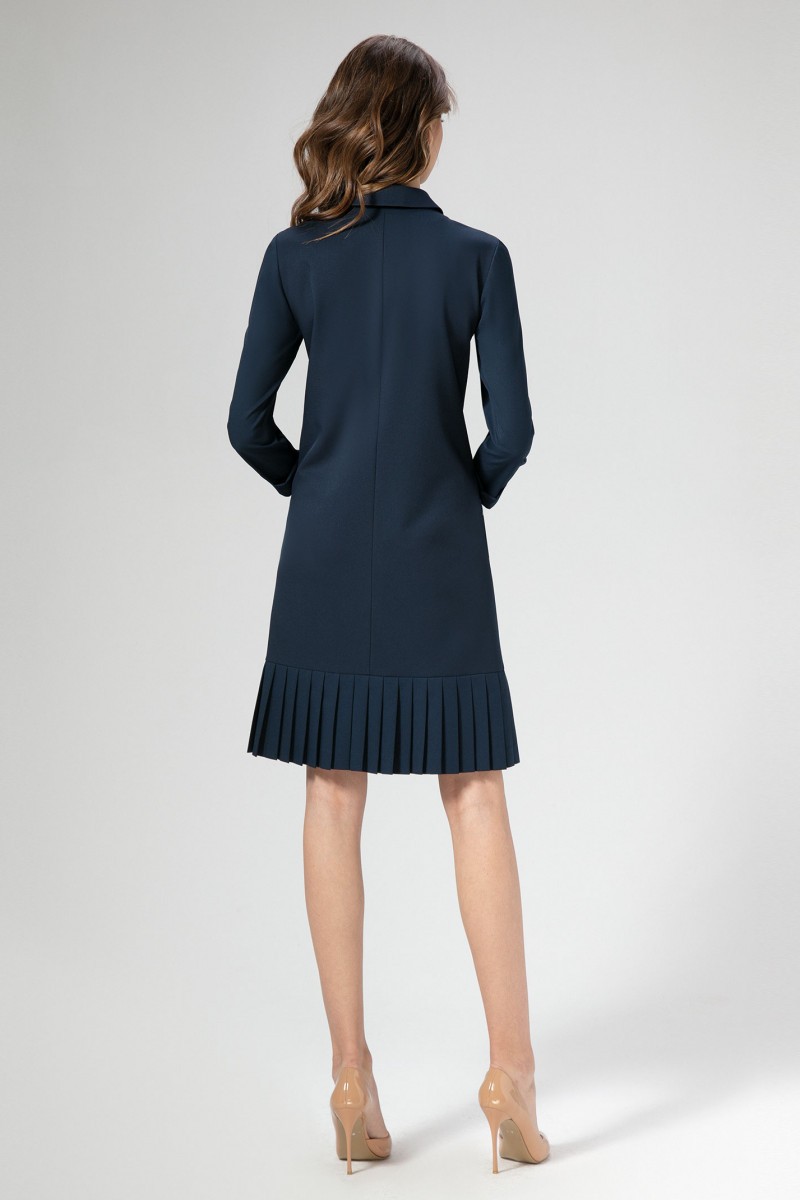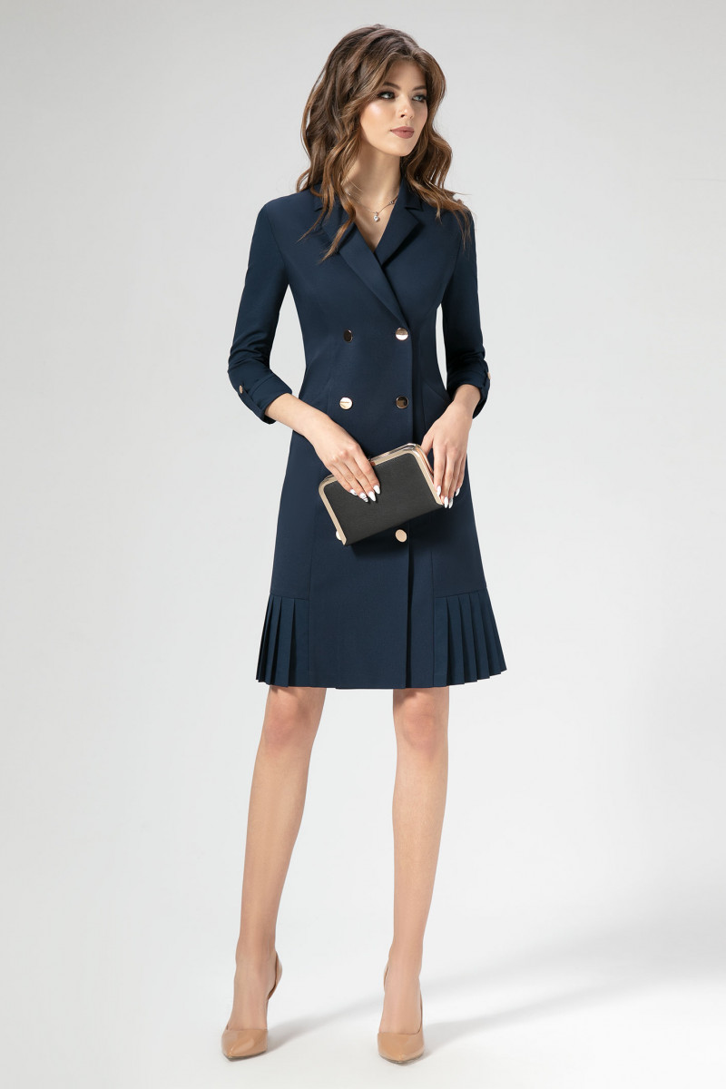 Элегантное,строгое, стильное платье с двубортной застёжкой эффектно декорировано золотыми пуговицами. Мягкая ткань совершенно не мнётся,приятна к телу и легка в уходе.Сочетание строгого V-образного выреза , пиджачного воротника, строгого прилегающего силуэта и игривой плессерованной вставки по низу платья помогает создать образ деловой и динамичный.Рукав втачной,укороченный,с отрезной манжетой по низу. Рлина рукава регулируется при помощи паты.Спереди на бочках выполнены наклонные резы,в которых оформлены удобные внутренние карманы.Идеальное платье для энергичной и стильной девушки на каждый день и в офис.