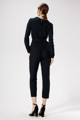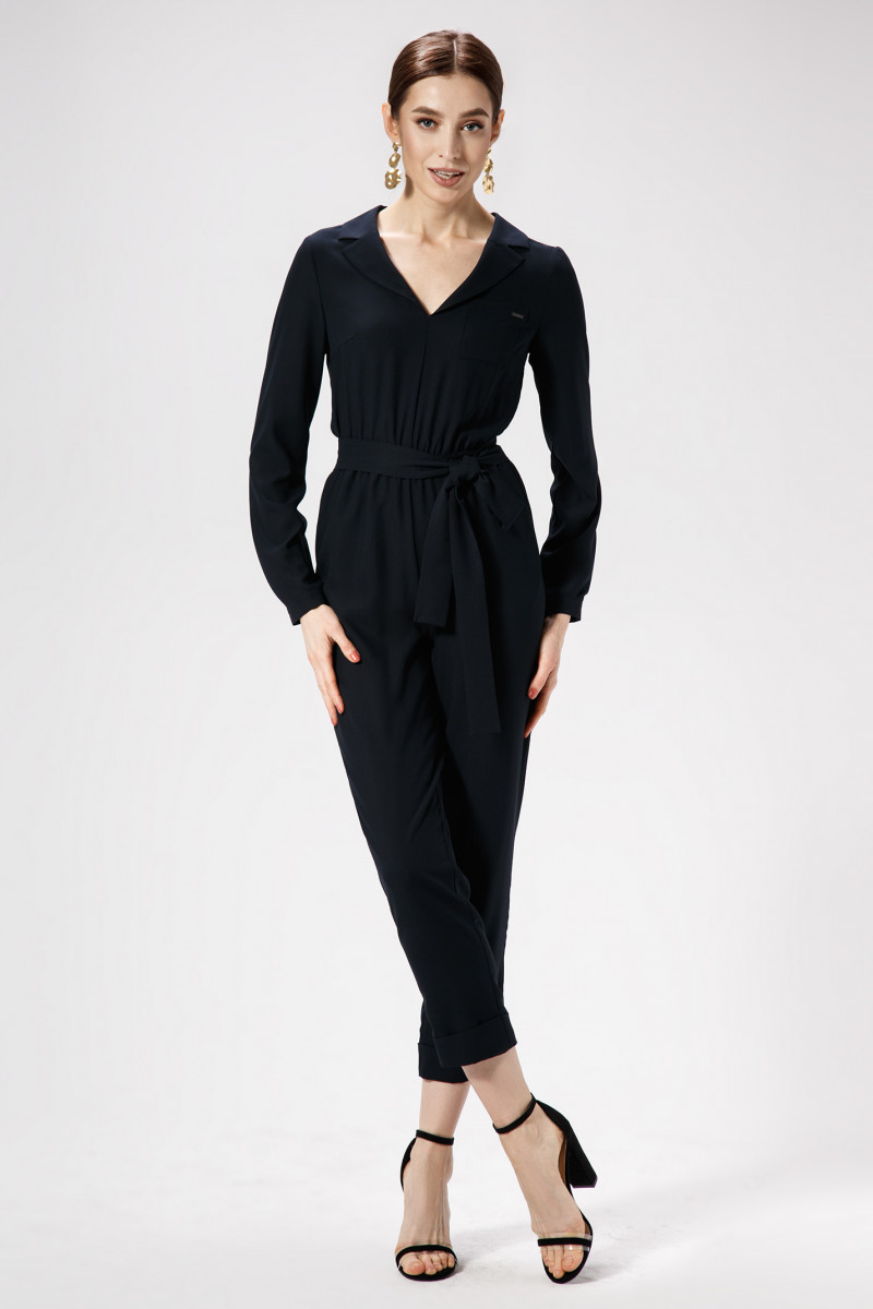 Эффектный нарядный комбинезон из мягкой струящейся шелкоподобной ткани. V-образный вырез горловины,обрамлённый воротником пиджачного типа. Рукав втачной ,длинный,чуть расширен и снизу прихвачен на тонкую манжету,застёгивающуюся на петлю и пуговицу. По спинке выполнен центральный шов с оформленной в нём потайной молнией. Комбинезон отрезной по линии талии и стянут на резинку.Брюки полуприлегающего силуэта с отложной манжетой по-низу. В боковых швах оформлены внутренние карманы. На талии пояс из основной ткани,завязывающийся спереди на бант. По переду выполнен накладной прямоугольный карман. Практичный ,удобный в носке и приятный к телу комбинезон порадует стильную и амбициозную девушку как на празднике,так и в повседневной жизни.