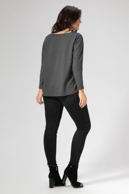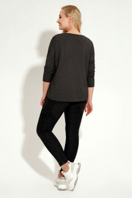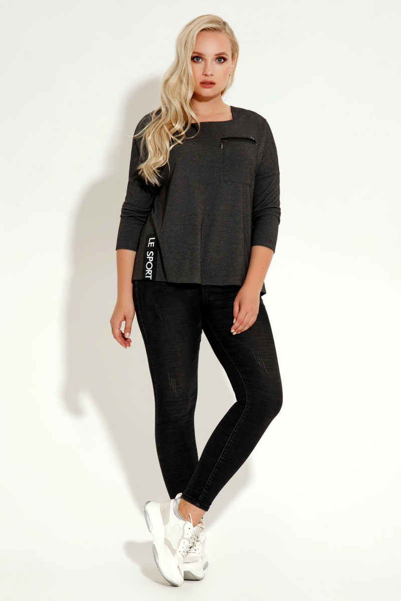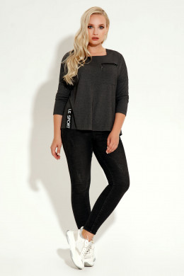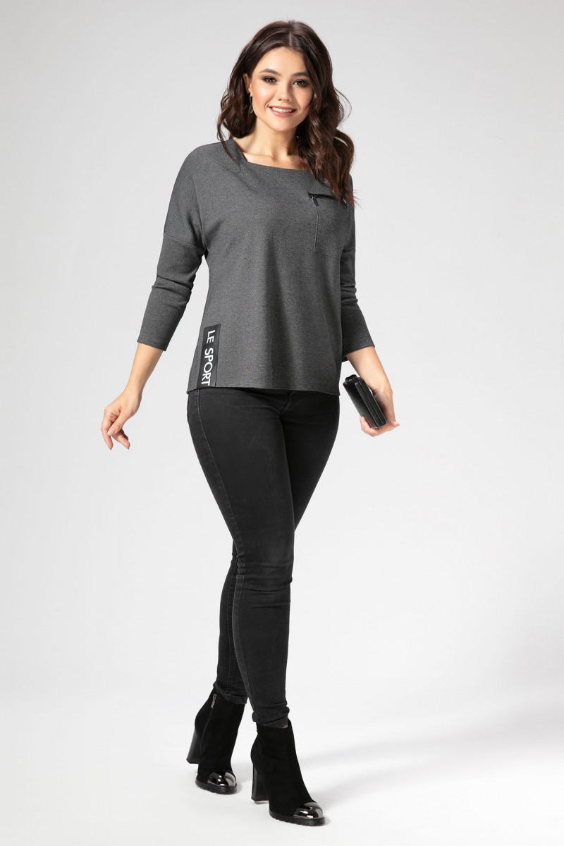 Джемпер трапецевидного силуэта.Длина рукава 3/4. Вырез горловины напоминает квадрат.Треугольные вставки не плечах ,накладной карман ,застёгивающийся на молнию контрастного цвета,настрачная декоративная деталь со шрифтовой вышивкой по низу изделия,всё гармонично сочетается и выглядит очень стильно.Спинка джемпера удлинена относительно переда.