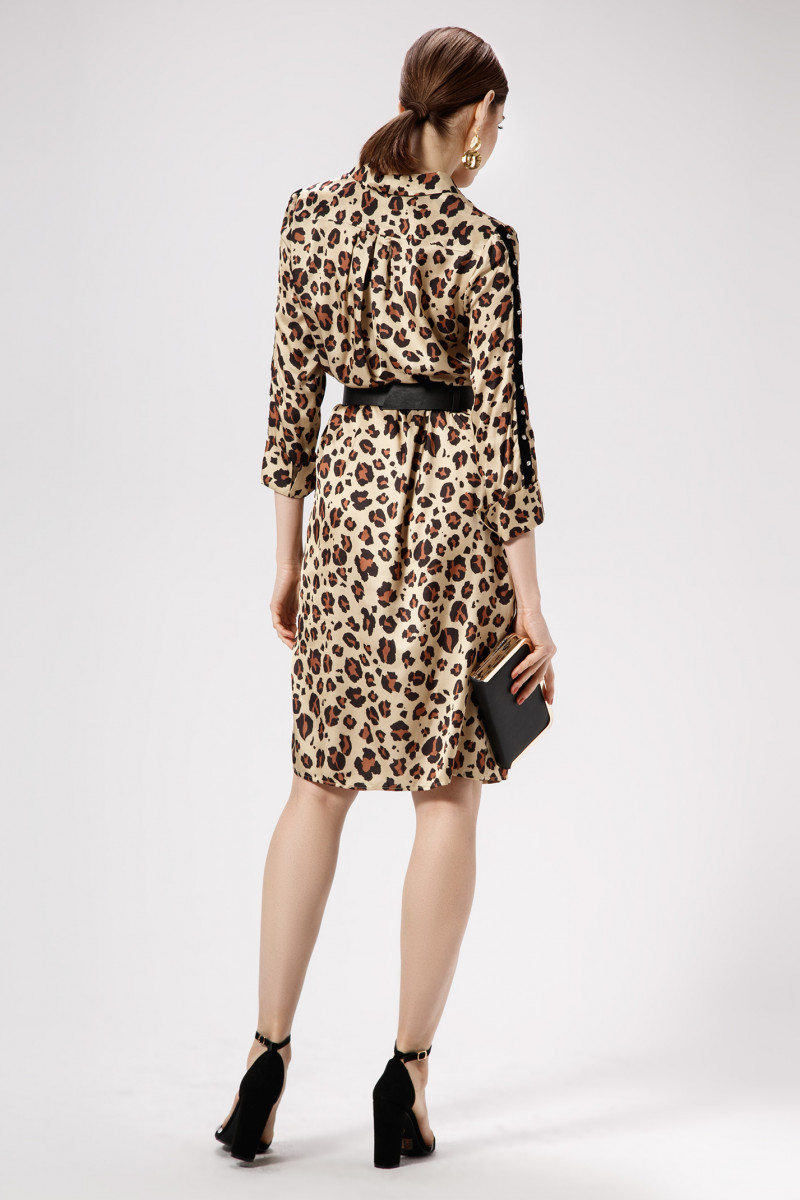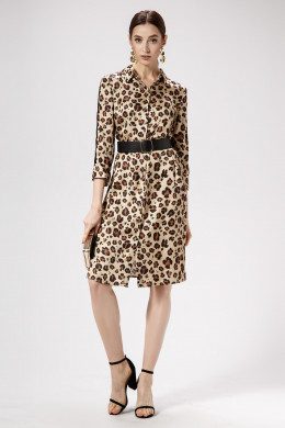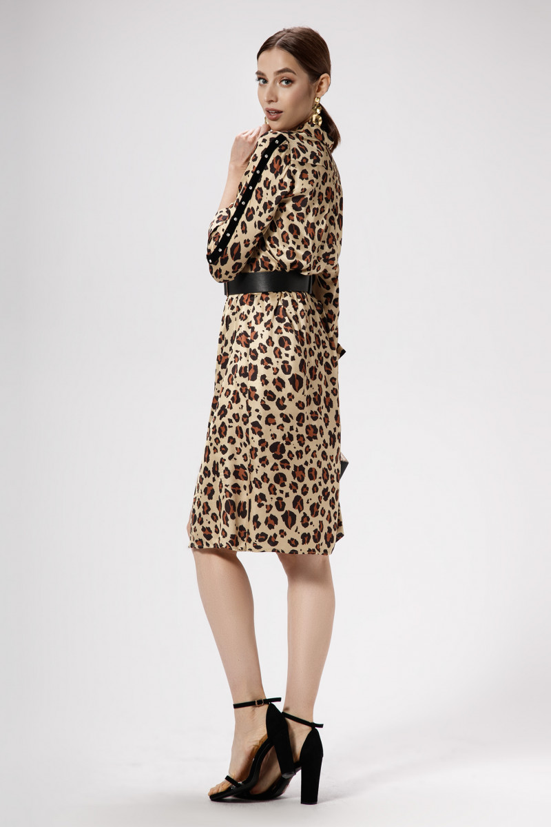 Эффектное платье, леопардовая расцветка, ткань вискозная . Платье- рубашка полуприлегающнго силуэта, с нагрудными вытачками, центральная застежка на петли пуговицы, в боковых швах разрезы. Спинка с кокеткой и складками от нее. Рукава 7/8 , с манжетами, по центру рукава декоративная тесьма со стразами. В комплект входит широкий пояс. В этом трендовом платье вы не останетесь незамеченной.