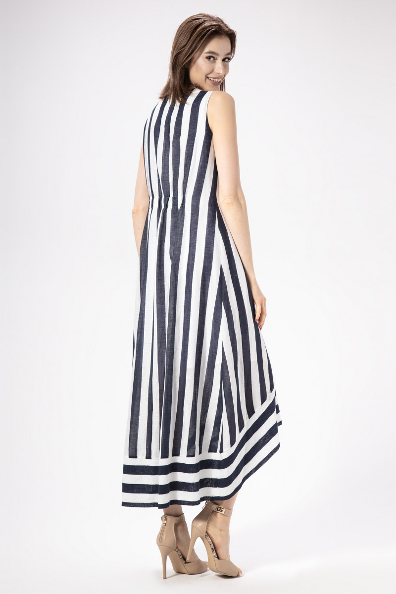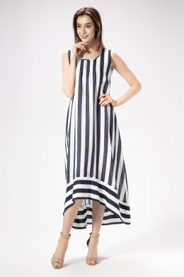 Стильный и очень модный сарафан свободного клешёного силуэта из тонкой льняной ткани с эффектым геометрическим принтом в виде широкой полосы.Прекрасный вариант для отдыха и на каждый день.Вырез горловины круглый.Вниз от горловины по переду выполнены защипы.Линия низа изделия неровная,спереди короче,а сзади длиннее.По низу притачена широкая отрезная планка. Сарафан развевается на ветру и придаёт образу лёгкость,романтичность и загадочность.