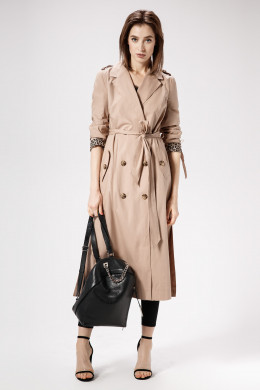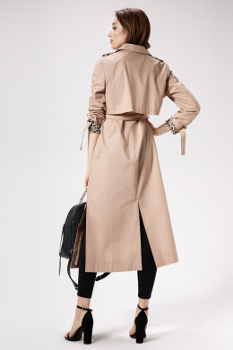 Стильный и удобный весенний плащь на подкладке выполнен из дышащей хлопковой плащёвой ткани .Застёжка в плаже двубортная на петли и пуговицы. На талии завязывается пояс из основной ткани.Вырез V-образный. Воротник отложной пиджачного типа.По плечам выполнены паты в виде погонов,застёгивающихся на петлю и пуговицу. Рукава втачные, по низу стягиваются на пату,которая фиксируется при помощи пряжки и держится за счёт шлёвок. По спинке выполнена удлинённая отлетная кокетка. В среднем шве спинки и в боковых швах выполнены высокие разрезы.Подкладка с леопардовым принтом придаёт изделию остроты и изящества. Очень стильный и удобный плащь для энергичной девушки ,которая любит выглядеть безупречно.
