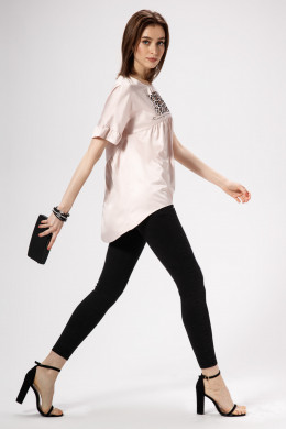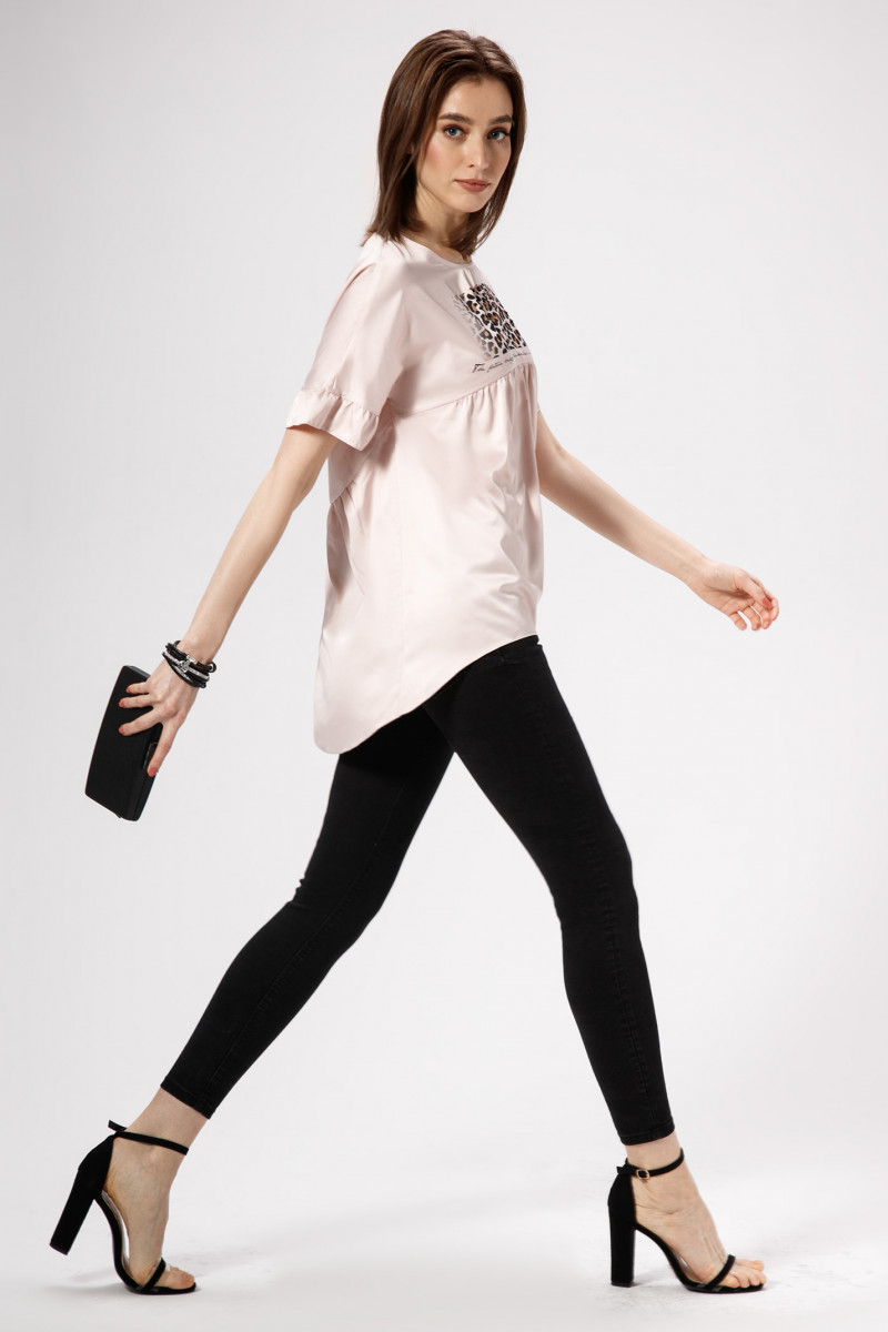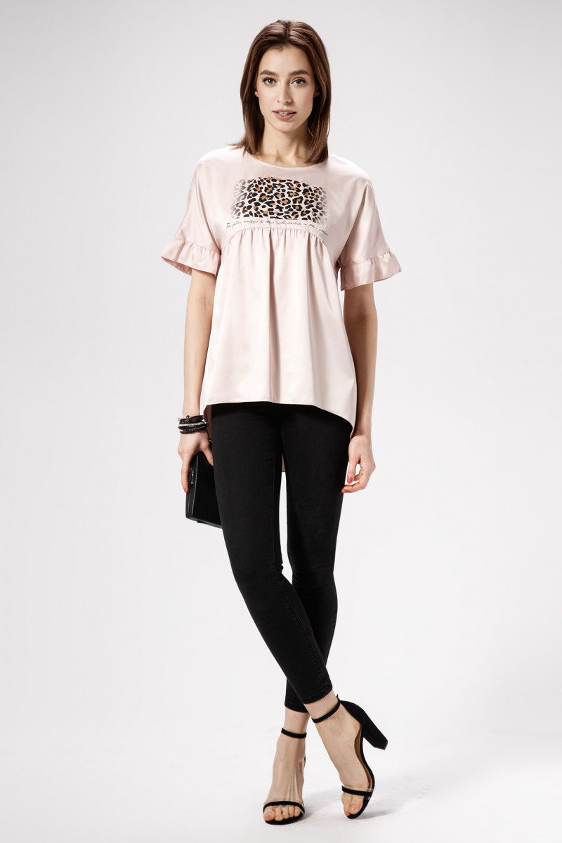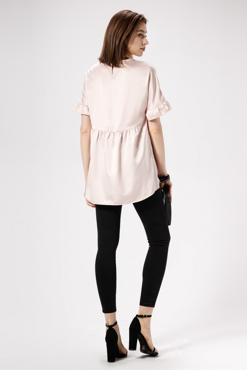 Лёгкая и невесомая атласная блузка чудесно дополнит летний гардероб стильной девушки,которая ценит комфорт ,изящность и изысканность линий.Блузка имеет короткий цельнокроёный рукав с рюшей по низу.По переду и по спинке выполнены резы фигурной формы.Нижние детали переда и спинки присборены сверху.Линия низа неровная:спереди короче,сзади длиннее.Застёжка на спинке на навесную петлю и пуговицу.Блузка декорирована графичным принтом спереди.