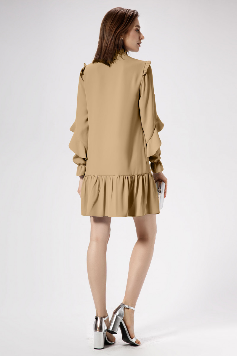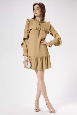 Легкость, романчтичность, очаровательность- это то, что объединяет обладательницу этого платья . Эффектное платье из струящейся ткани, полуприлегающего силуэта, слегка расширенное к низу, с рюшей по горловине и тесьмой завязывающейся на бантик , с наргудными вытачками, отрезное по линии бедер, с кокеткой и рюшей от нее, плавно переходящей в рукав, рукава втачные по окату со сборкой рюша, в нижней детали рукава резинка собранна в волан. Спинка отрезная по линии бедер. Платье создано для романтичных и изящных девушек, нет никаких сомнений в том , что обладательница этого платья, будет выглядеть безупречно.