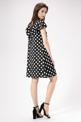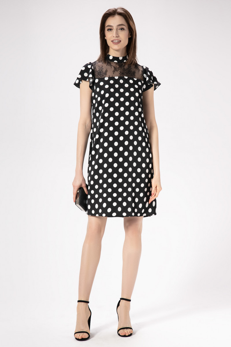 Платье в сочетинии" горошка "с кружевом делает модель уникальной, дизайнеры воплотили стремление к совершенству и желание показать всю силу женской красоты. Платье свободного силуэта слегка расширенное к низу, кокетка из кружева ,горловина на стойке. Спинка с фигурной кокеткой и разрезом по центрру, от кокетки волан переходящий в рукав, рукав короткий со сборкой по окату. Нет никаких сомнений в том, что обладательница этого платья, будет выглядеть безупречно.