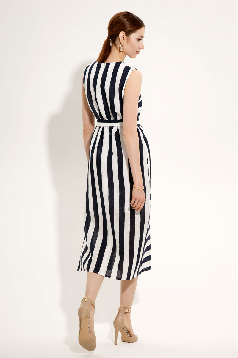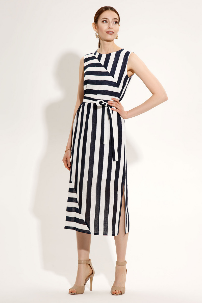 Стильное длинное платье на хлопковой подкладке от талии ,без рукава.Выполнено из тончайшего , приятного на ощупь льна с графичным принтом. Силуэт платья трапецевидный, но талию можно эффектно подчеркнуть при помощи пояса,выполненного из основной ткани. По переду задуманы резы, помогающие создать эффектную игру полос. Вырез горловины круглый. Застёжка на потайную молнию в среднем шве спинки. В боковых швах оформлены внутренние карманы. С одной стороны по низу выполнен разрез. Прекрасный вариант платья на каждый день в жаркую летнюю погоду для яркой стильной девушки,которая ценит в одежде красоту,качество и комфорт.