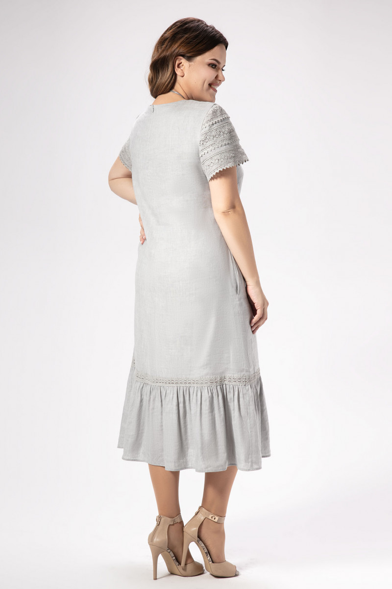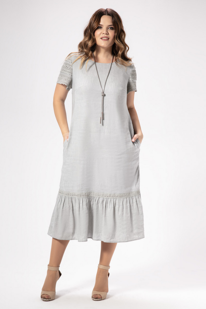 Лаконичное платье из натуральной льняной ткани дополнено изящным хлопковым кружевом. Платье полуприлегающего силуэта, длиной ниже коленей, по переду вытачки, в боковых швах карманы. По низу широкий волан. Рукава короткие, декорированы хлопковым кружевом. Платье на натуральной подкладки. Отличный вариант для любого светского мероприятия.