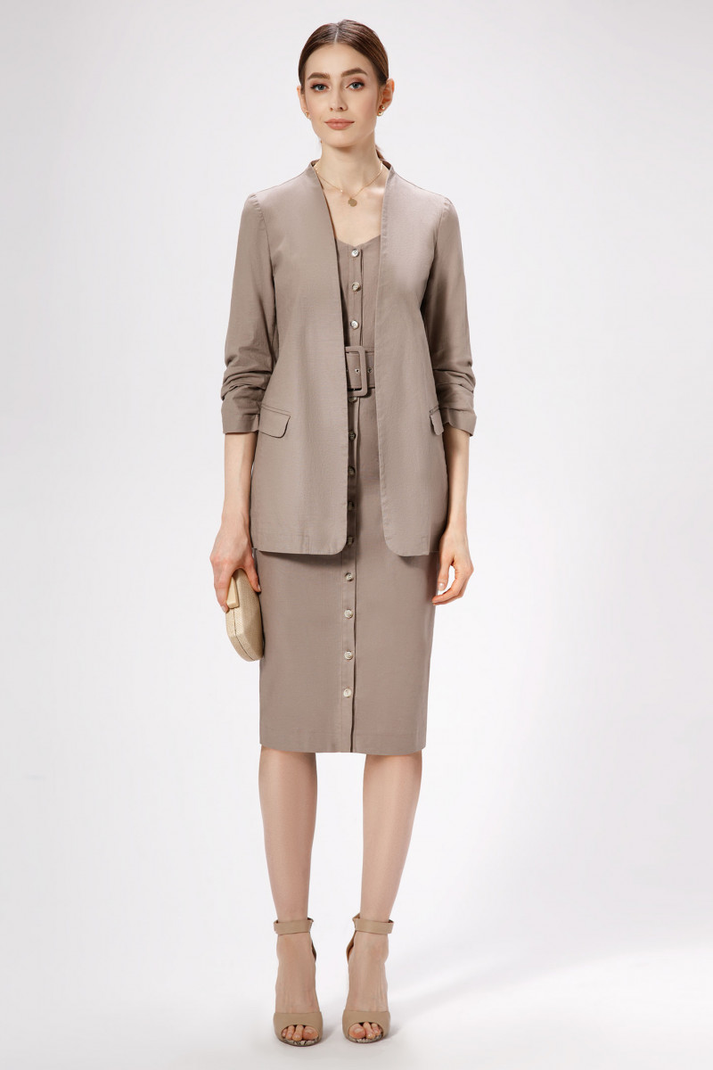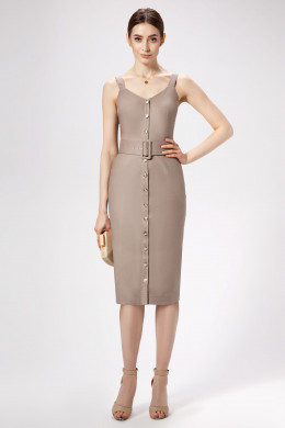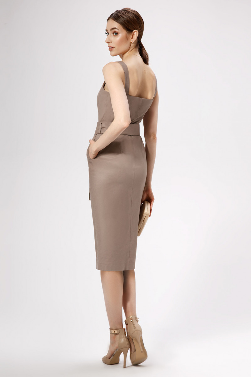 Стильный сарафан из льняной ткани. Сарафан плотнооблегающего силуэта, длиной ниже коленей, с центральной сквозной застежкой на петли и пуговицы. По переду и по спинки имеются вытачки, которые обеспечивают посадку по фигуре. По бокам карманы. Сарафан дополнен съёмным широким поясом из основной ткани. Сарафан отлично подойдет для жарких летних дней или в сочетании с жакетом отличный вариант для офиса.