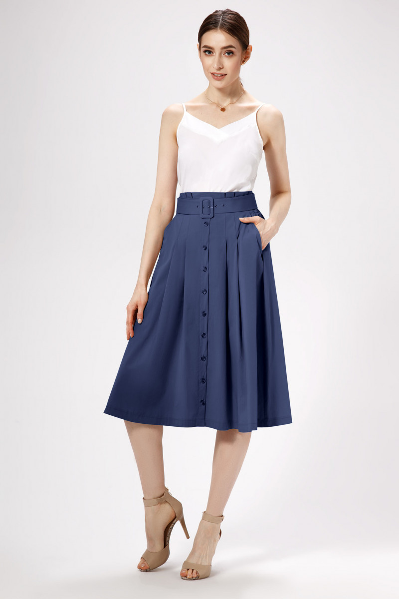 Стильная трендовая юбка длиной ниже коленей из хлопковой ткани. Юбка на талии на резинке, со съёмным декоративным поясом из основной ткани, по бокам имеются карманы. По переду юбки имеются по две складочки с каждой стороны, по центру имитация застежки - планка с пуговицами. Такая юбка отлично сочетается с различными джемперами и предполагается носить как с кроссовками,так и с каблуками создавая различный образ на каждый день.