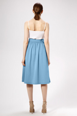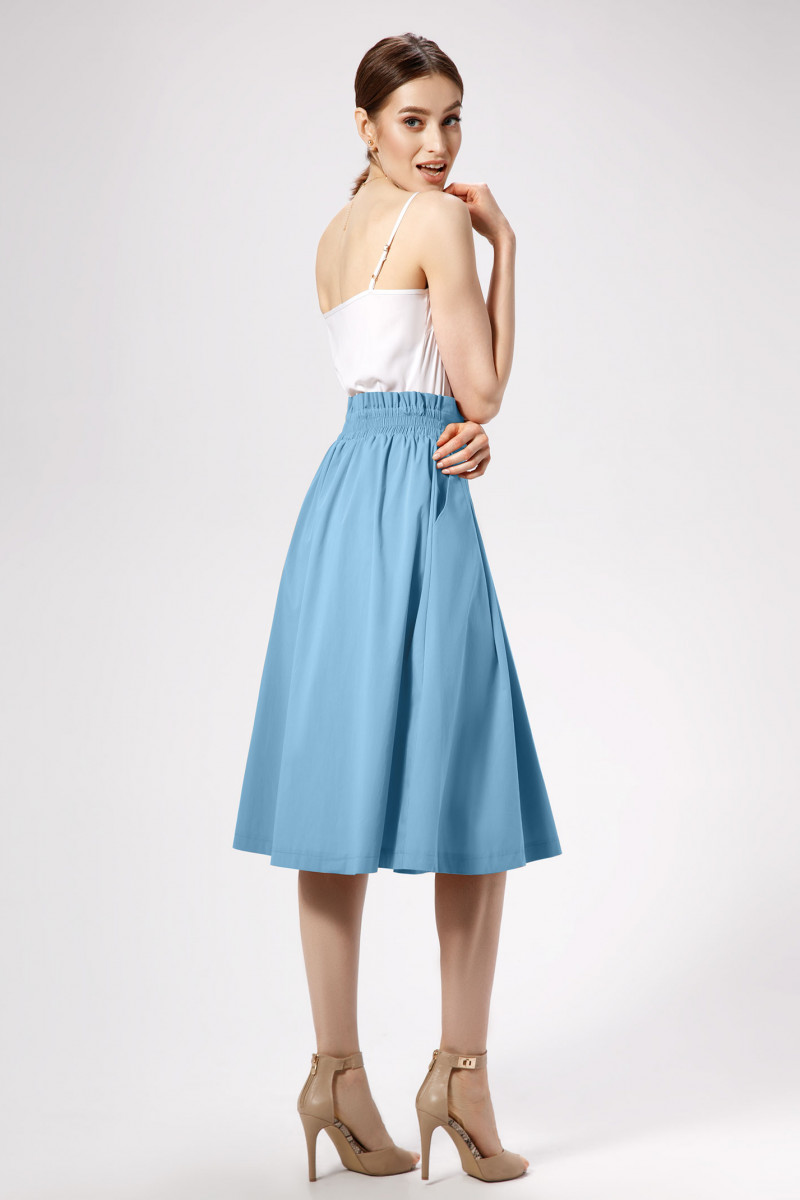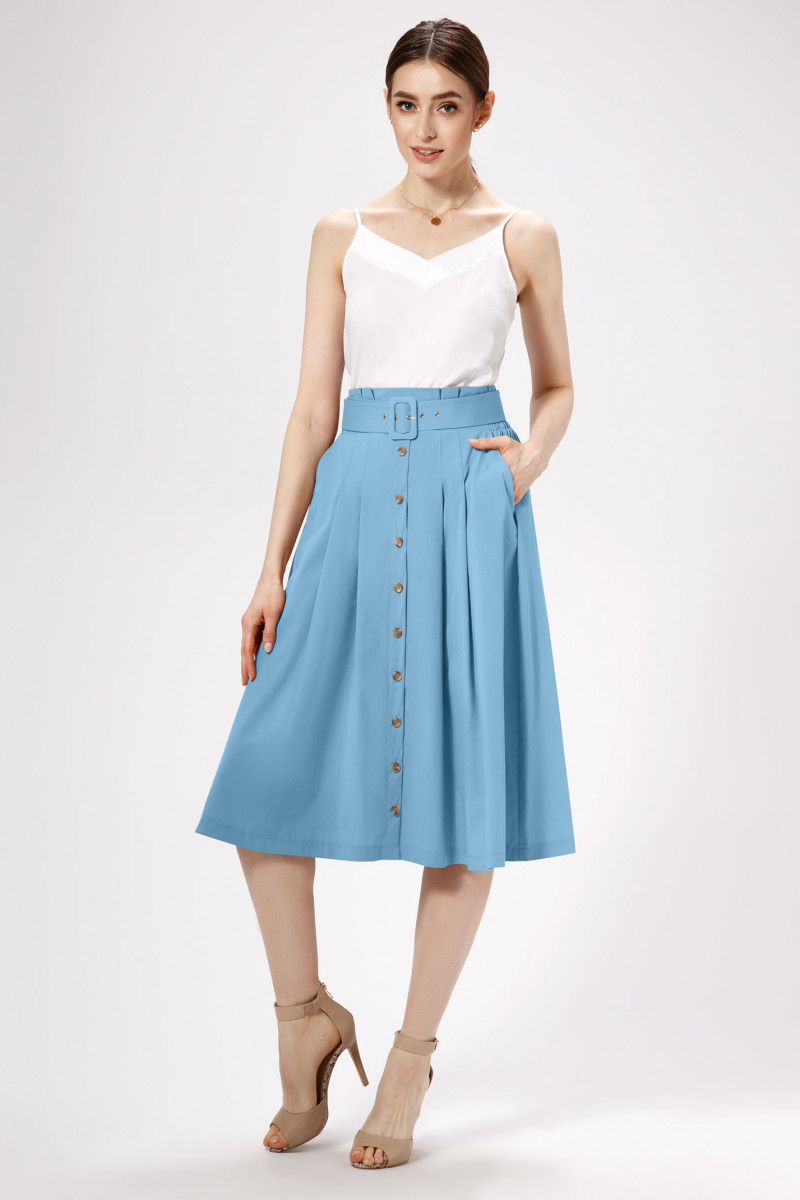 Стильная трендовая юбка длиной ниже коленей из хлопковой ткани. Юбка на талии на резинке, со съёмным декоративным поясом из основной ткани, по бокам имеются карманы. По переду юбки имеются по две складочки с каждой стороны, по центру имитация застежки - планка с пуговицами. Такая юбка отлично сочетается с различными джемперами и предполагается носить как с кроссовками,так и с каблуками создавая различный образ на каждый день.