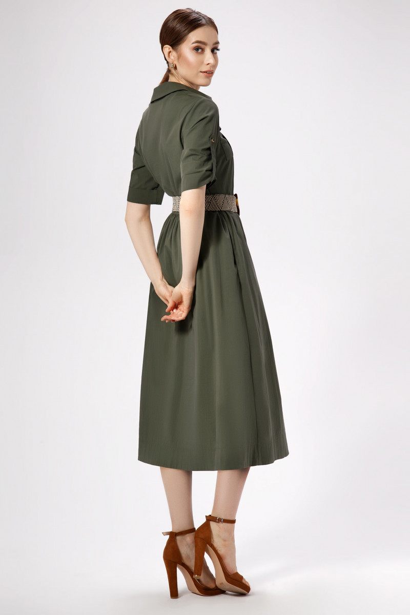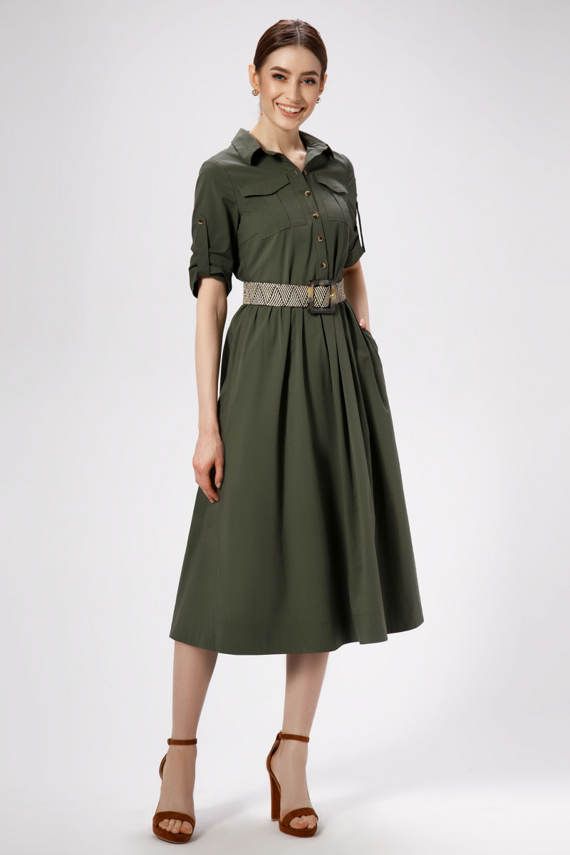 Платье миди – модная модель сезона, которая вашу фигуру стройнее, благодаря приталенному силуэту и ремешку. Платье с воротником рубашечного типа, нагрудными и прорезными боковыми карманами смотрится стильно, лаконично. Рукава с манжетами и патами открывают изящные линии рук. Платье рубашка из хлопкового полотна – мягкое, приятное на ощупь. Оно отлично отводит влагу, пропускает воздух, не сминается. Вы можете купить женское платье в комплекте с красивым съемным декоративным поясом.