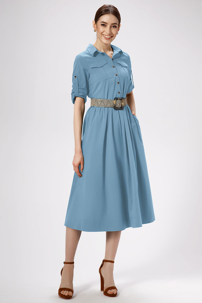 Платье миди – модная модель сезона, которая вашу фигуру стройнее, благодаря приталенному силуэту и ремешку. Платье с воротником рубашечного типа, нагрудными и прорезными боковыми карманами смотрится стильно, лаконично. Рукава с манжетами и патами открывают изящные линии рук. Платье рубашка из хлопкового полотна – мягкое, приятное на ощупь. Оно отлично отводит влагу, пропускает воздух, не сминается. Вы можете купить женское платье в комплекте с красивым съемным декоративным поясом.