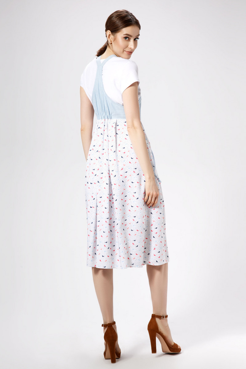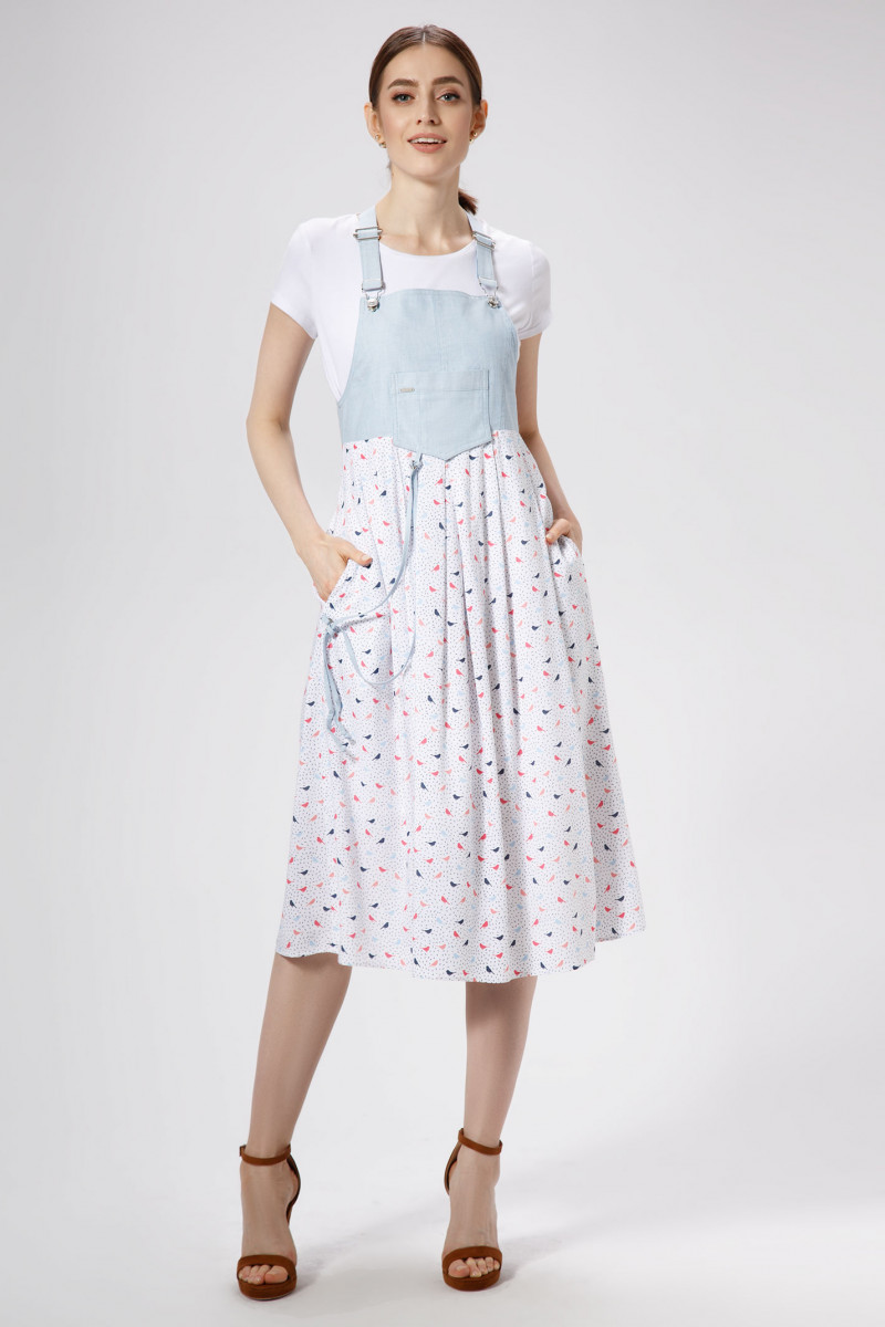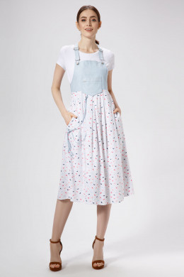 Хлопковый лёгкий оригинальный сарафан на отстёгивающихся бретелях. Отрезной лиф ,бретели и накладной карман выполнены из более плотной и формоустойчивой ткани. Нижняя часть сарафана расклешена книзу и выполнена из тонкой ,струящейся вискозы с нежным летним принтом. В боковых срезах юбки оформлены внутренние карманы. Перед декорирован шнурами,протянутыми в металлические полукольца от кармана на лифе к правому боковому срезу. Длина бретелей легко регулируется. Сарафан женственный и романтичный идеально подойдёт для летних прогулок и порадует качеством исполнения.