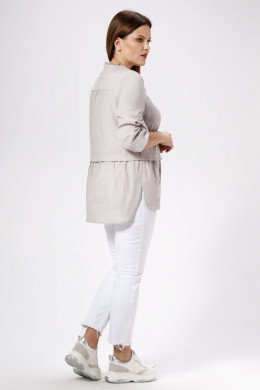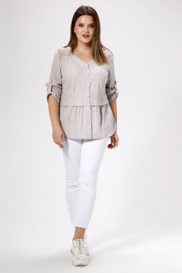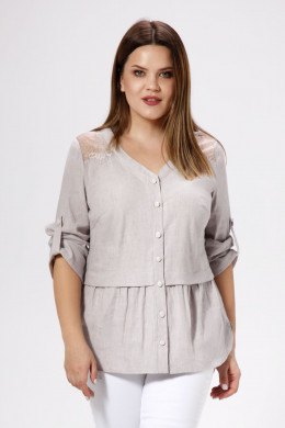 Стильная блузка из льняной ткани, в дополнении с кружевом, блузка создана для девушек, которые умеют совмещать работу и отдых. Детали переда с V- образным вырезом горловины, от планк горловины кружево в тон блузке, планка на петли пуговицы, кокетки кружевные, по линии талии горизонтально расположена отрезная деталь, линия низа фигурной формы, с перепадом длины. Спинка с кокеткой и отрезной деталью по линии талии. Рукава втачные, 3/4, с отложными манжетами и патой.