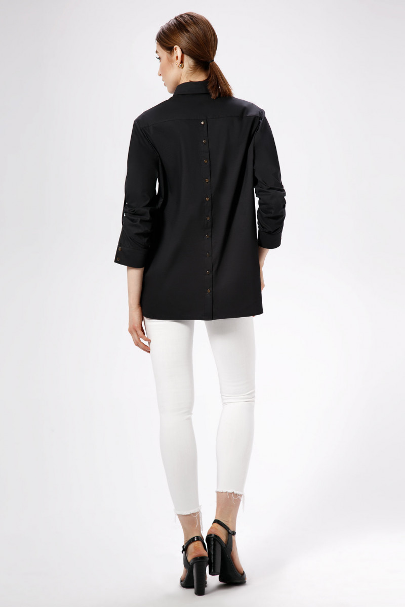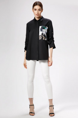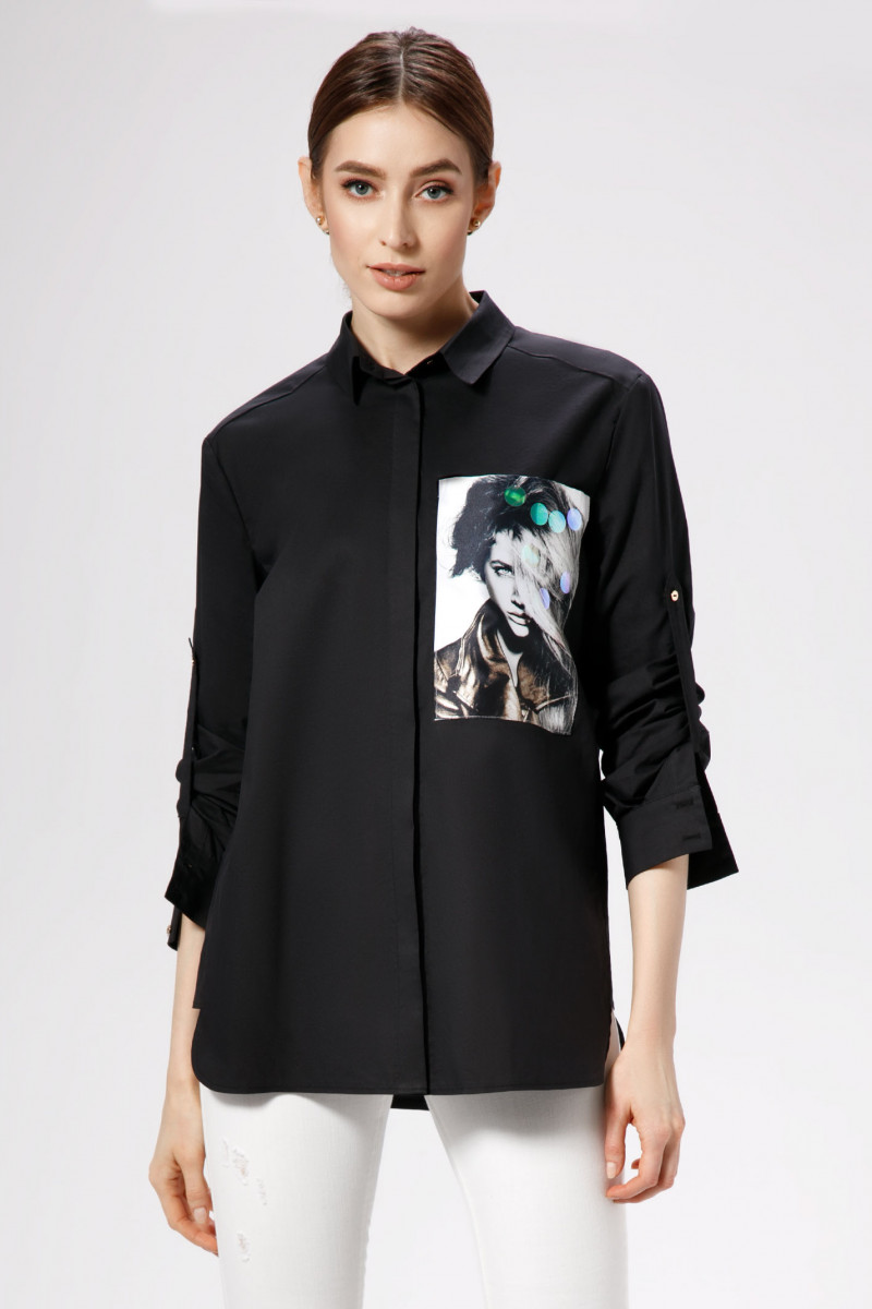 Стильная удлиненная блузка выполнена из хлопковой ткани. Блузка прямого силуэта, с длинными рукавами на манжете,с декоративными патами, с сорочечным воротником на отрезной стойки. Застежка по переду на потайные петли и пуговицы. Спинка декорирована имитацией планки с петлями и пуговицами, идущей от кокетки. Изящество модели придает декор, нанесенный на кармане. Такая блузка отлично впишется с джинсами в стиле кэжуал.