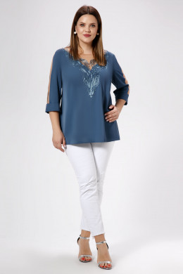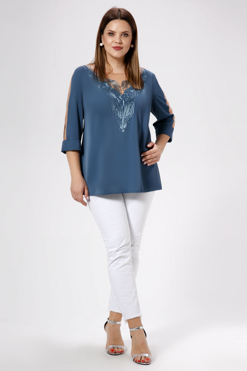 Нарядная блузка из струящейся ткани. Блузка прямого силуэта,по бокам разрезы, с рукавами длиной чуть ниже локтя с отложными манжетами. По переду нагрудные вытачки. Блузка с глубоким декольте, которое украшено вышивкой объемным шнуром. Блузка дополнено вставками из прозрачной телесной сетки, которые имитируют оголенное тело. Очень нарядный вариант для торжественных случаев.