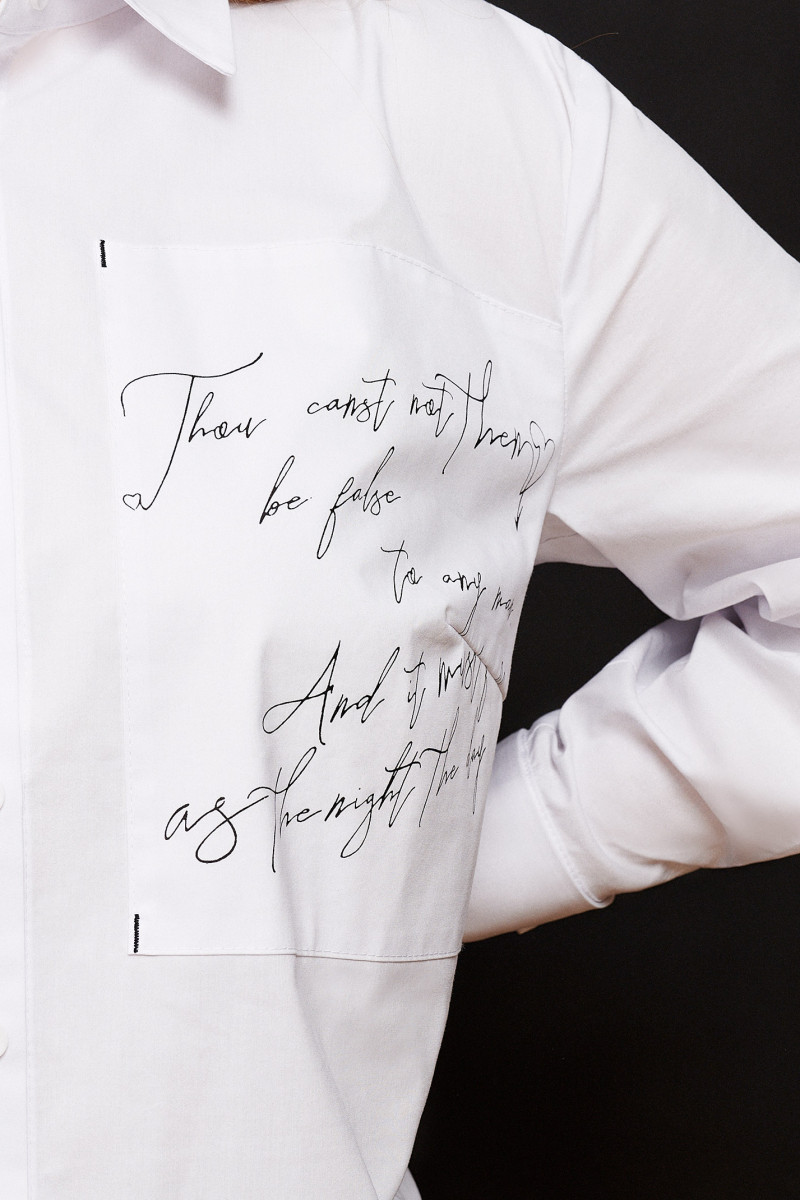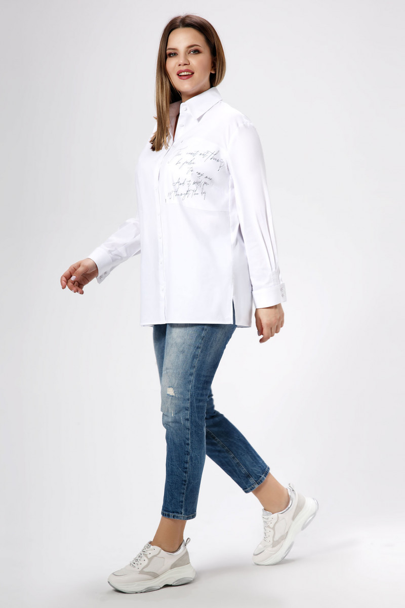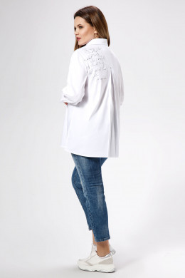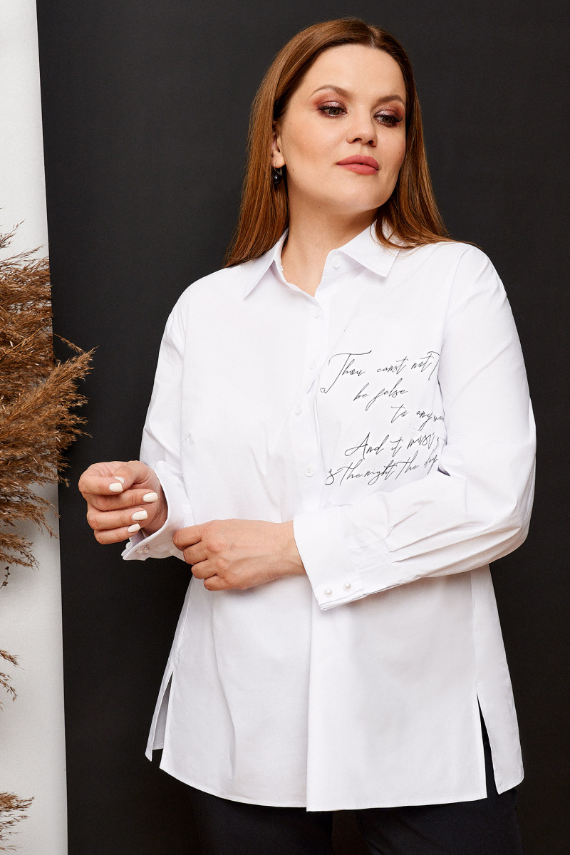 Классический шик, из хлопковой ткани, блузка свободного силуэта, с центральной застежкой на петли пуговицы, с нагрудными вытачками, левая боковая деталь декорирована печатью, воротник отложной со стойкой, спинка со встречной складкой, от не деталь декорирована печатью, рукава втачные, на широкой манжете. Хороший вариант как для офиса, так и для выхода в свет.