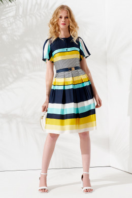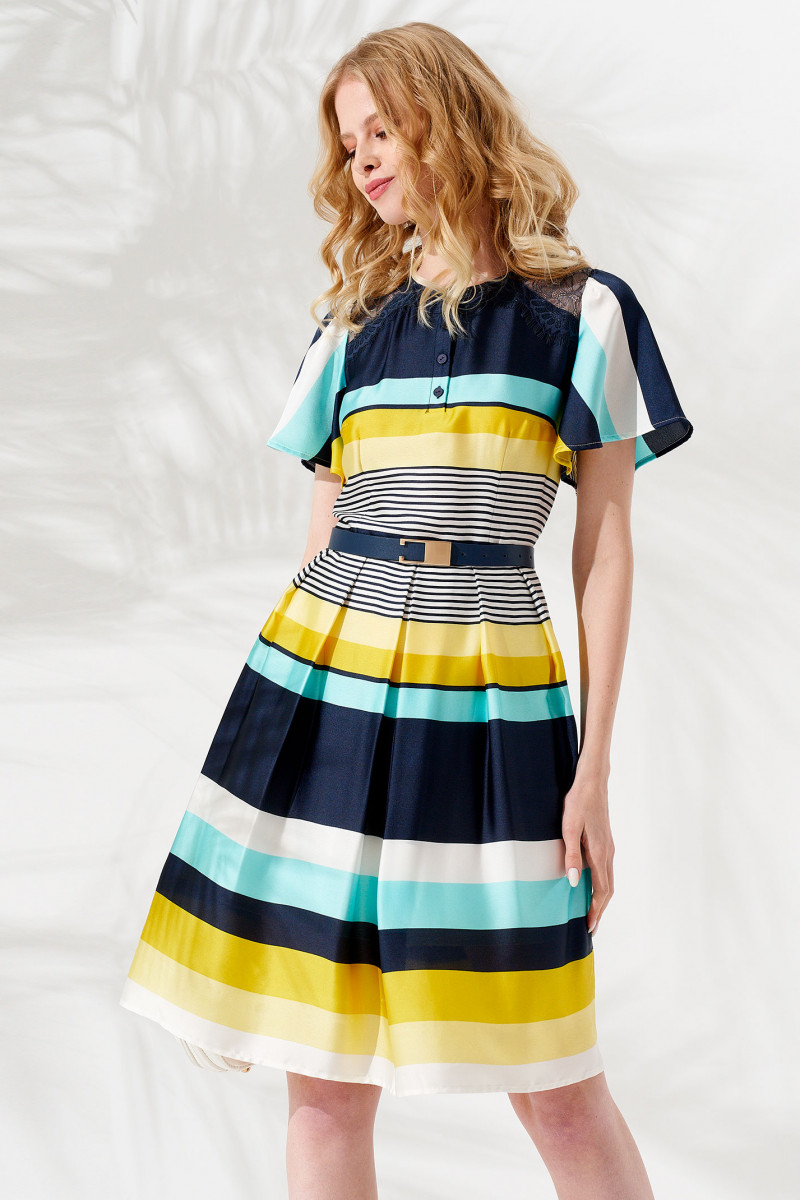 Бесспорным трендом этого года будет полоска принт, эффектное платье полуприлегающего силуэта, по линии талии отрезное, от талии книзу расширенное, от горловинки планка на петли пуговицы, с нагрудными и талиевыми вытачками, с кружевными кокетками, от линии талии грубокие складки, в боковом шве тесьма- молния.. Спинка отрезня , складки от линии талии. Рукава втачные, короткие, со сборкой по окату. Пояс входит в комплект. Все эксперименты с платьем априори будет выглядеть стильно и непревзойденно, благодаря оригинальному принту создает потрясающий образ для уверенной в себе девушке.