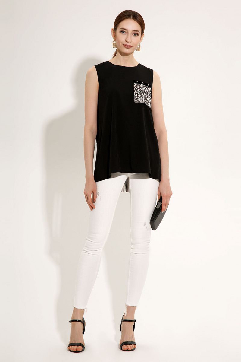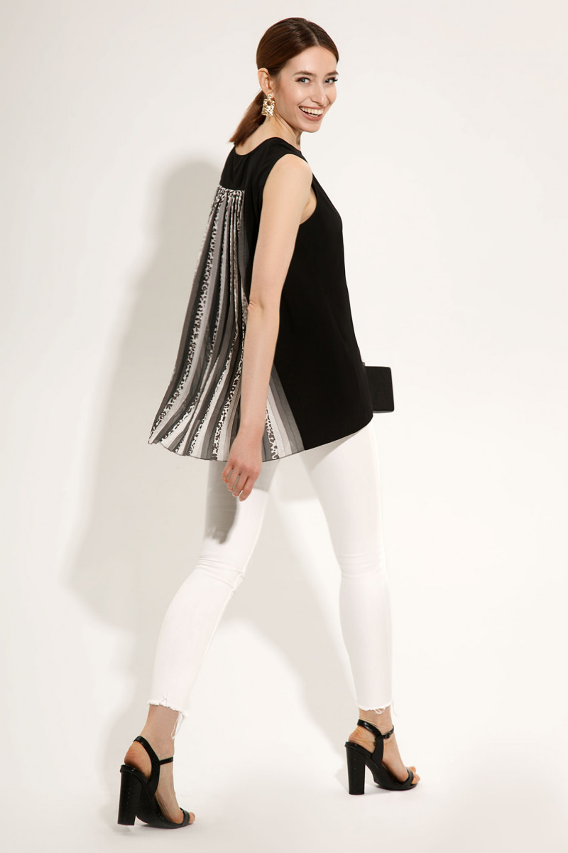 Очень эффектная стильная туника современного кроя .Состоит из двух тканей: однотонный, чёрный ,струящийся , текстиль и плиссерованный шифон с графичным принтом. Перед туники однотонный с декоративной накладной деталью ,дополненной отделочной тесьмой. Вырез горловины круглый.По спинке выполнены отрезная кокетка и бочки. Центральная часть спинки плессированная и при движении выглядит потрясающе .Низ переда туники имеет округлую форму.Спинка удлинена относительно переда и имеет ровную горизонтальную линию низа.