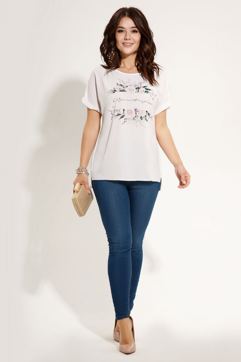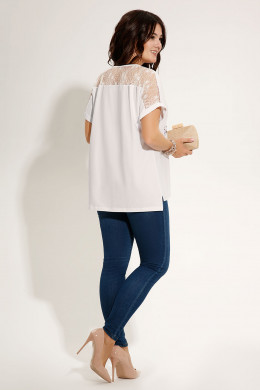 Лёгкий летний джемпер ,повседневный и нарядный одновременно.Нежный и невесомый цветочный принт украшает изделие спереди,а ажурное лёгкое кружево изящно дополняет спинку. Перёд текстильный,а спинка эластичная ,трикотажная. Рукав цельнокроеный,спущенный,короткий,по низу с отложной манжетой. Вырез горловины круглый. Спинка длиннее переда.По бокам выполнены неглубокие разрезы. Прекрасный вариант летнего джемпера на каждый день ,освежает свою обладательницу и дарит хорошее настроение.