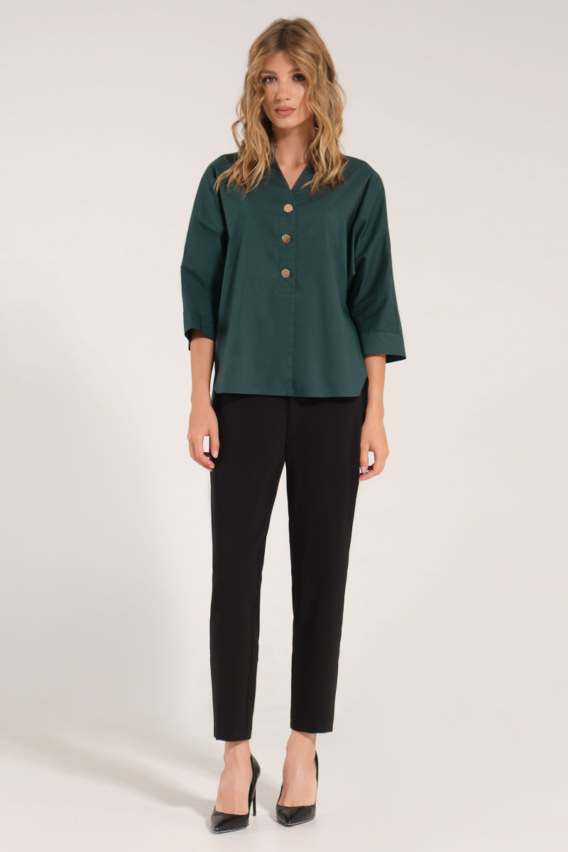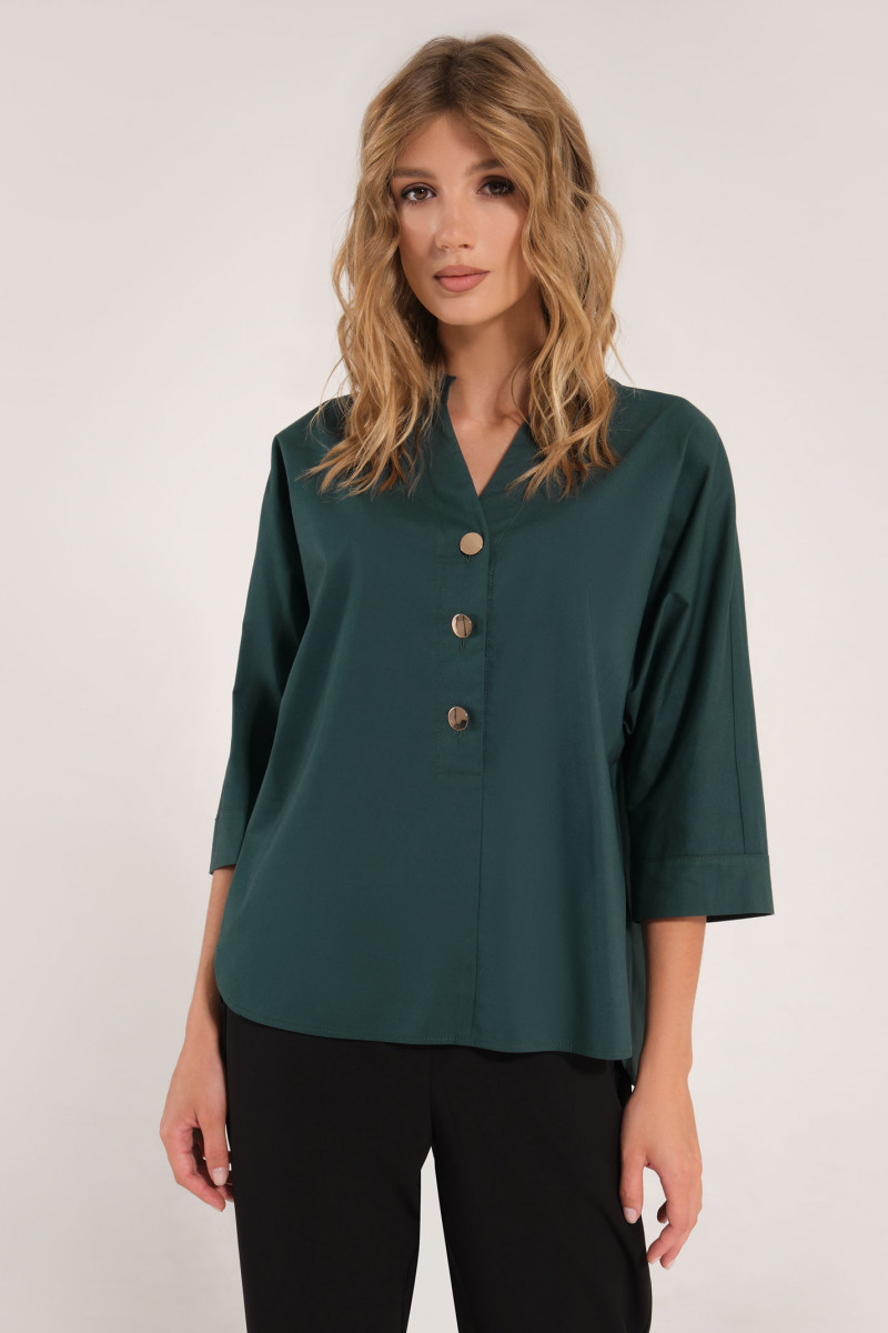 Блузка офисная свободного кроя со спущенной линией плеча. Перед с воротником-стойкой и V-образным вырезом, подчеркнутым блестящими пуговицами на центральной застежке. Блузка летняя женская украшает аккуратный закругленный низ, разрезы в боковом шве и удлиненная спинка с пришивной кокеткой и складкой. Это обеспечивает идеальную посадку на плечах.