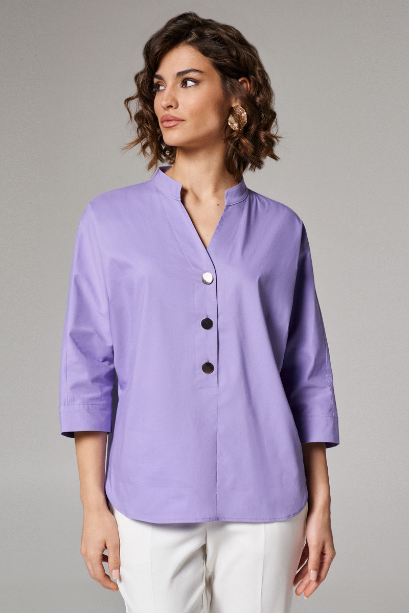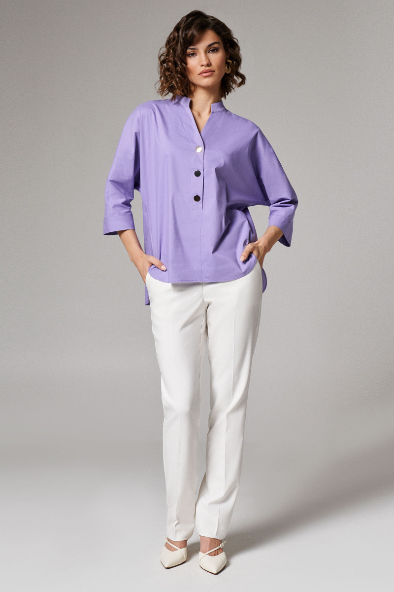 Блузка офисная свободного кроя со спущенной линией плеча. Перед с воротником-стойкой и V-образным вырезом, подчеркнутым блестящими пуговицами на центральной застежке. Блузка летняя женская украшает аккуратный закругленный низ, разрезы в боковом шве и удлиненная спинка с пришивной кокеткой и складкой. Это обеспечивает идеальную посадку на плечах.