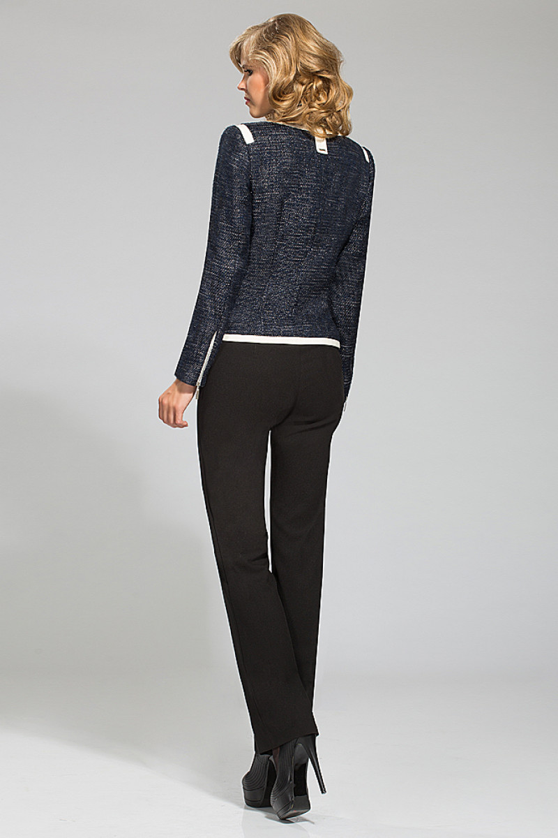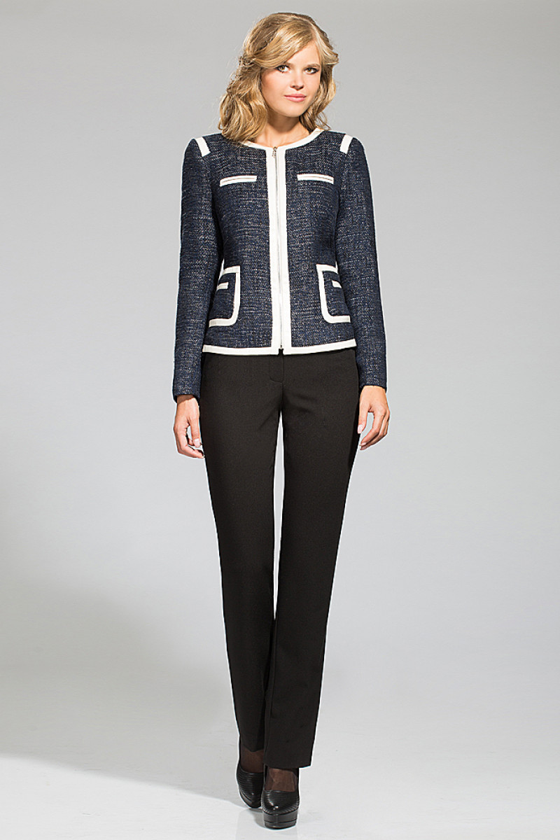 Жакет из ткани в стиле Шанель темно-синего цвета. Полуприлегающего силуэта. Без воротника, с овальным вырезом горловины, по горловине отделка из молочной кожи. Застежка на металлическую "молнию". По застежке отделка из кожи. Спереди 4 кармана, 2 нагрудных прорезных, вход оформлен в рамку из кожи молочного цвета, 2 накладных - с отделкой из кожи молочного цвета. Вход оформлен в рамку из кожи. С длинным рукавом, с молниями в локтевых швах. На спинке под планку по горловине вставлена пата из кожи.На подкладке.