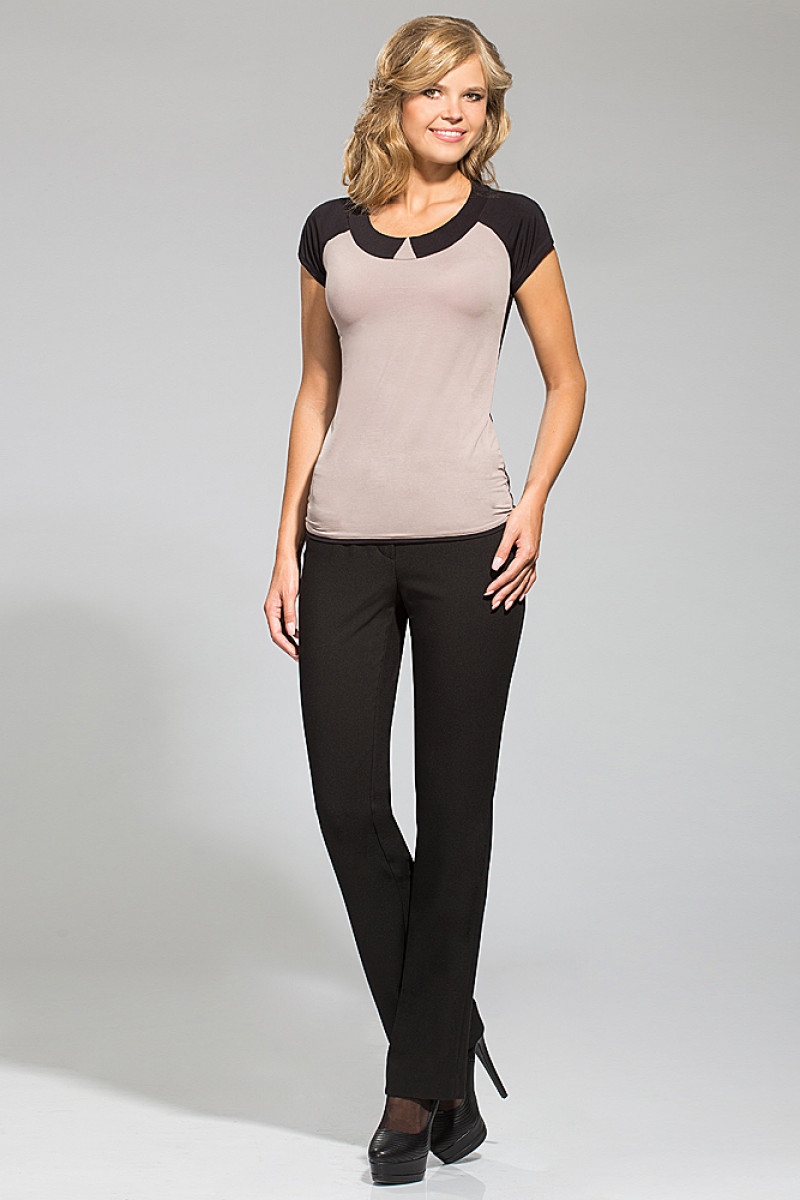 Джемпер из тонкого трикотажа. Прилегающего силуэта. С овальным вырезом горловины, с имитацией воротника по переду из трикотажа черного цвета. Перед из трикотажа бежевого цвета. По спинке планка. С рукавом классический реглан, с манжетой. Рукава, манжеты, спинка, планки выполнены из трикотажа черного цвета.