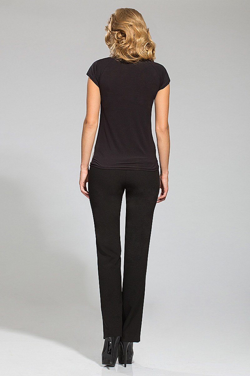 Брюк из плотной такни черного цвета. Прямые. На поясе, с застежкой на 1 пуговицу и 1 петлю. Передние половины брюк с кокеткой, в подрезах кокетки карманы.Задние половины брюк с карманом-обманкой, вход оформлен листочкой.