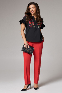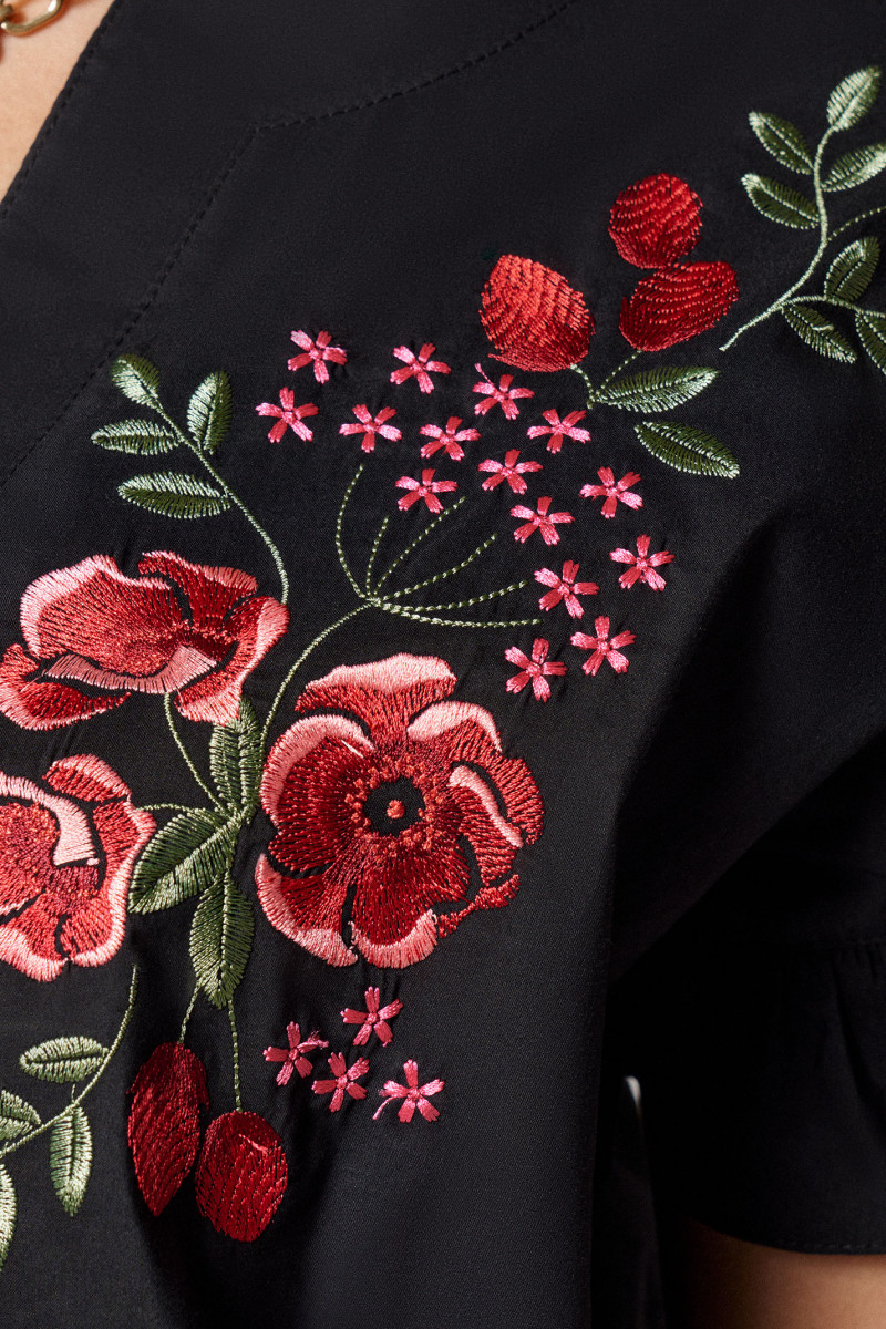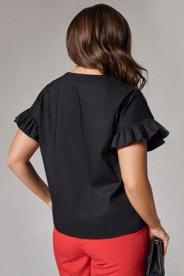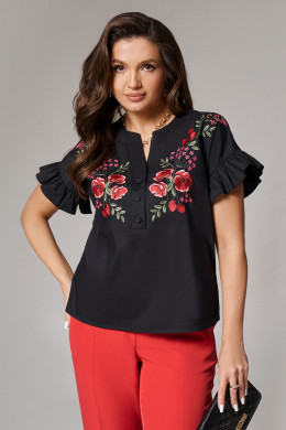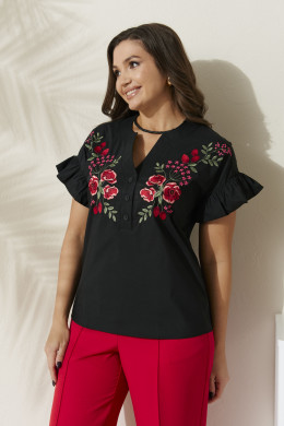 Блуза женская из хлопчатобумажной ткани для повседневной носки. Горловина с V-образным вырезом и планкой, застежка на обметанные петли и пуговицы. Рукав короткий, оформленный рюшей. На переде располагается дизайнерская вышивка. В данной блузке вы будете выглядеть безупречно и элегантно.