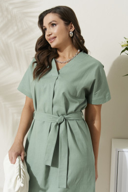 Платье из льняной ткани для повседневной носки. Силуэт платья прямой, рукав короткий цельнокроеный оформлен отложной манжетой. Горловина платья V-образная. В боковых швах разрезы от низа изделия. Платье укомплектовано поясом из основной ткани изделия.