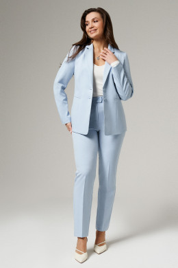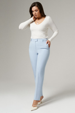 Брюки женские из костюмной ткани для повседневной носки. Брюки заужаются к низу. В пояс брюк вставлена резинка. По переду в боковых швах имеются карманы.