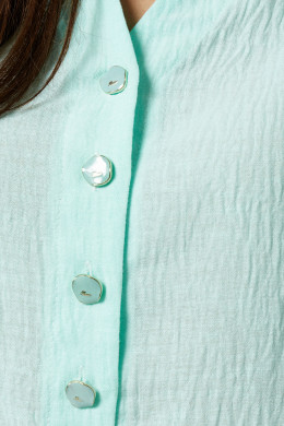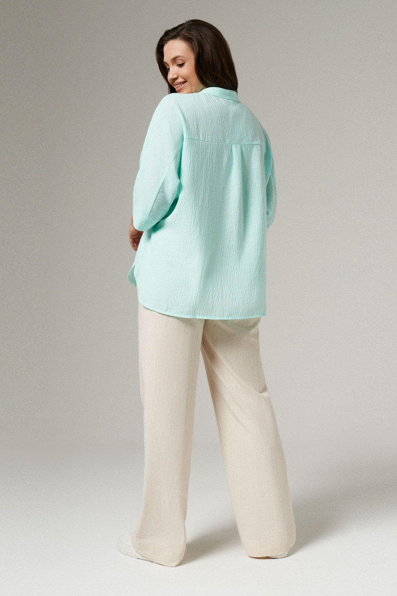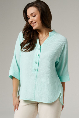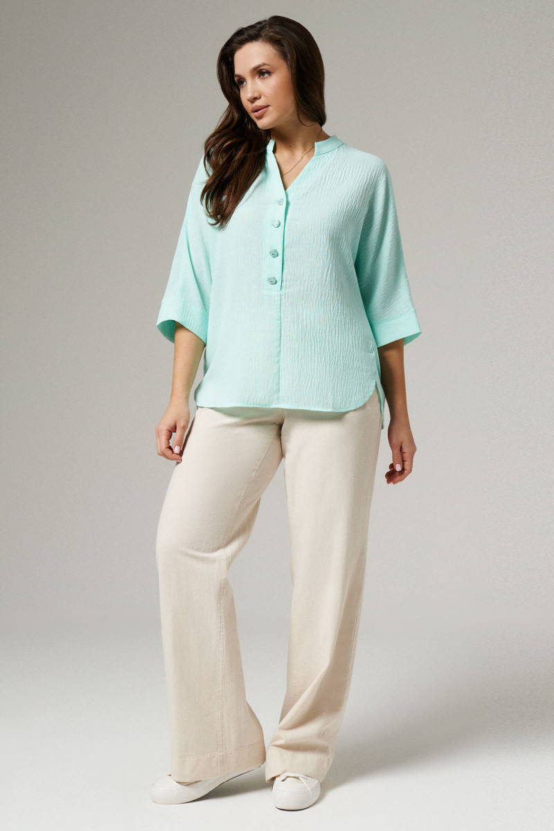 Оригинальная женская блузка из лёгкой хлопковой ткани, прямого силуэта, со спущенной линией плеча, горловина оформлена стойкой, центральная застежка до линии груди на четыре декоративные пуговицы, боковые швы книзу смещены на деталь переда, линия низа фигурной формы. Рукава 3/4, цельнокроеные, с отрезной манжетой. Спинка с кокеткой и складками от нее. Хороший вариант для работы и отдыха.