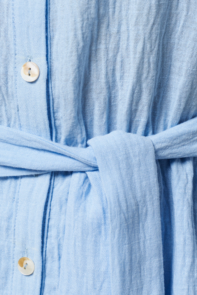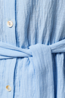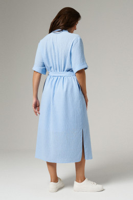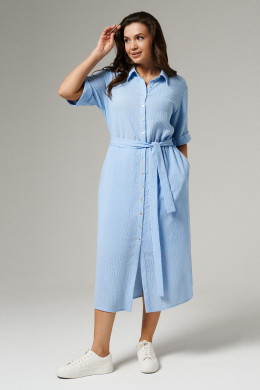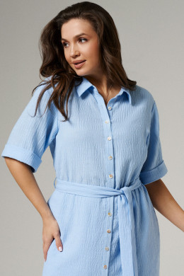 Платье женское из хлопковой ткани для повседневной носки. Изделие А-силуэта с втачным укороченным рукавом, оформленным притачной отложной манжетой, застегивающейся на пуговицу. Платье на подкладке. Платье с фронтальной застежкой на пуговицы, воротником- стойкой. По линии талии вставлена резинка. В боковых швах прорезные карманы, разрезы от низа изделия. Длина до середины голени.