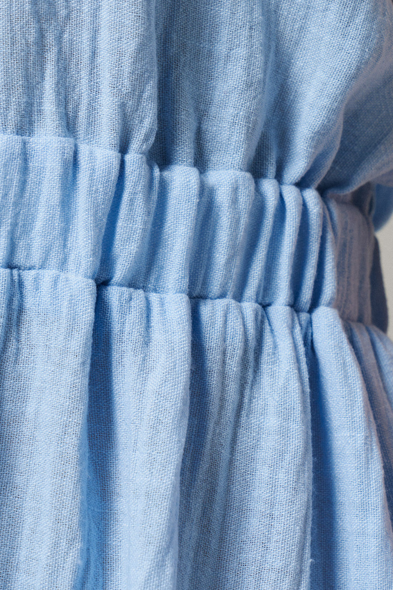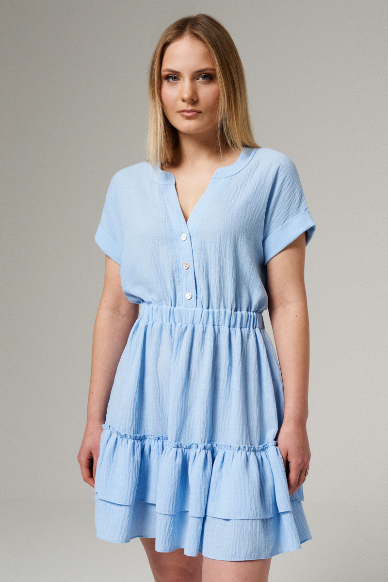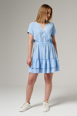Платье женское из хлопковой ткани для повседневной носки. Изделие А-силуэта с коротким цельнокроеным рукавом оформленным притачной манжетой. По низу юбки два яруса рюш. По талии вставлена резинка. По переду застежка на пуговицы до талии. Горловина оформлена стойкой. Длина изделия до колена.