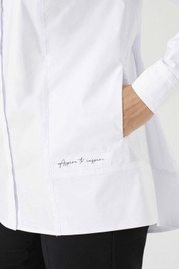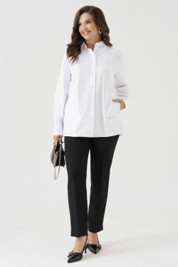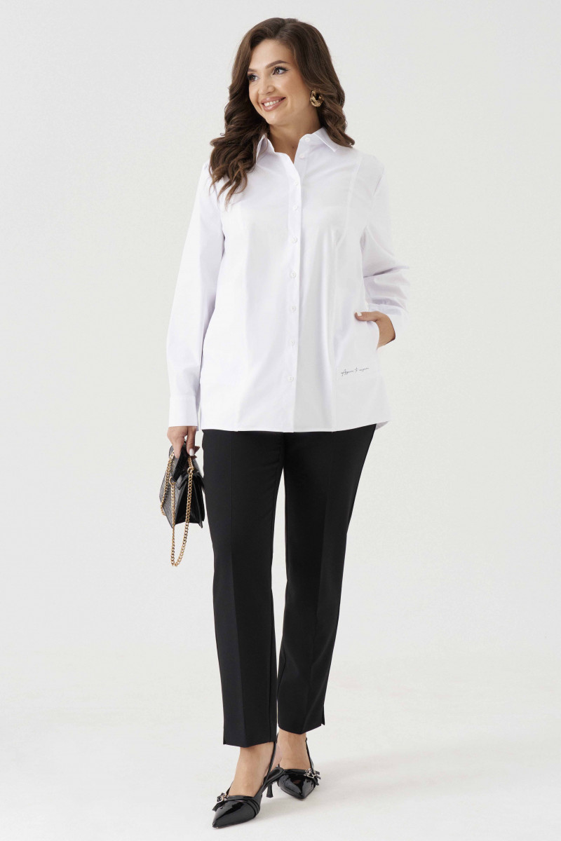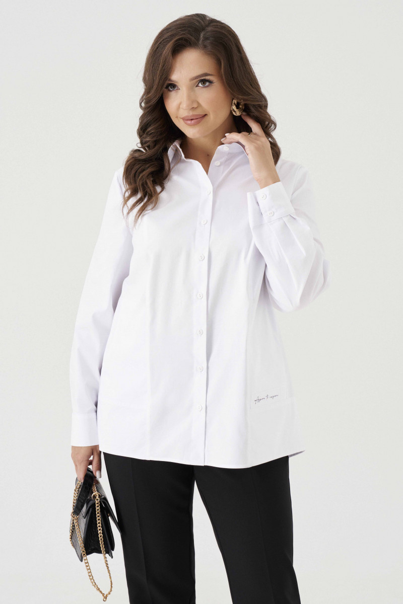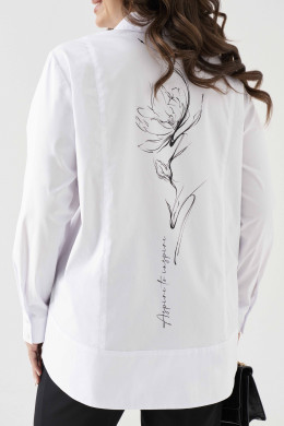Блузка женская из хлопковой ткани для повседневной носки полуприлегающего силуэта. Застежка в блузке на восемь обметанных петель и восемь пуговиц. Перед имеет вертикальные рельефы, идущие от линии плеча до линии низа, а также на переде располагается боковой прорезной карман в шве. Изделие отрезное по боковой и задней части низа. Спинка имеет два вертикальных рельефа, идущих от линии плеча до отрезной части низа. А также на центральной части спинки дизайнерская печать в виде цветка. По переду и по низу печать в виде букв. Горловина обработана рубашечным воротником. Рукава втачные, низ рукава обработан притачной манжетой с застежкой на две обметанные петли и две пуговицы. Модная и интересная блузка.