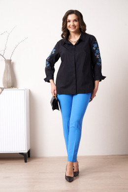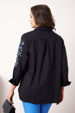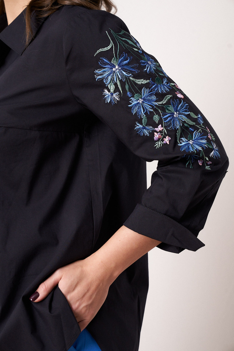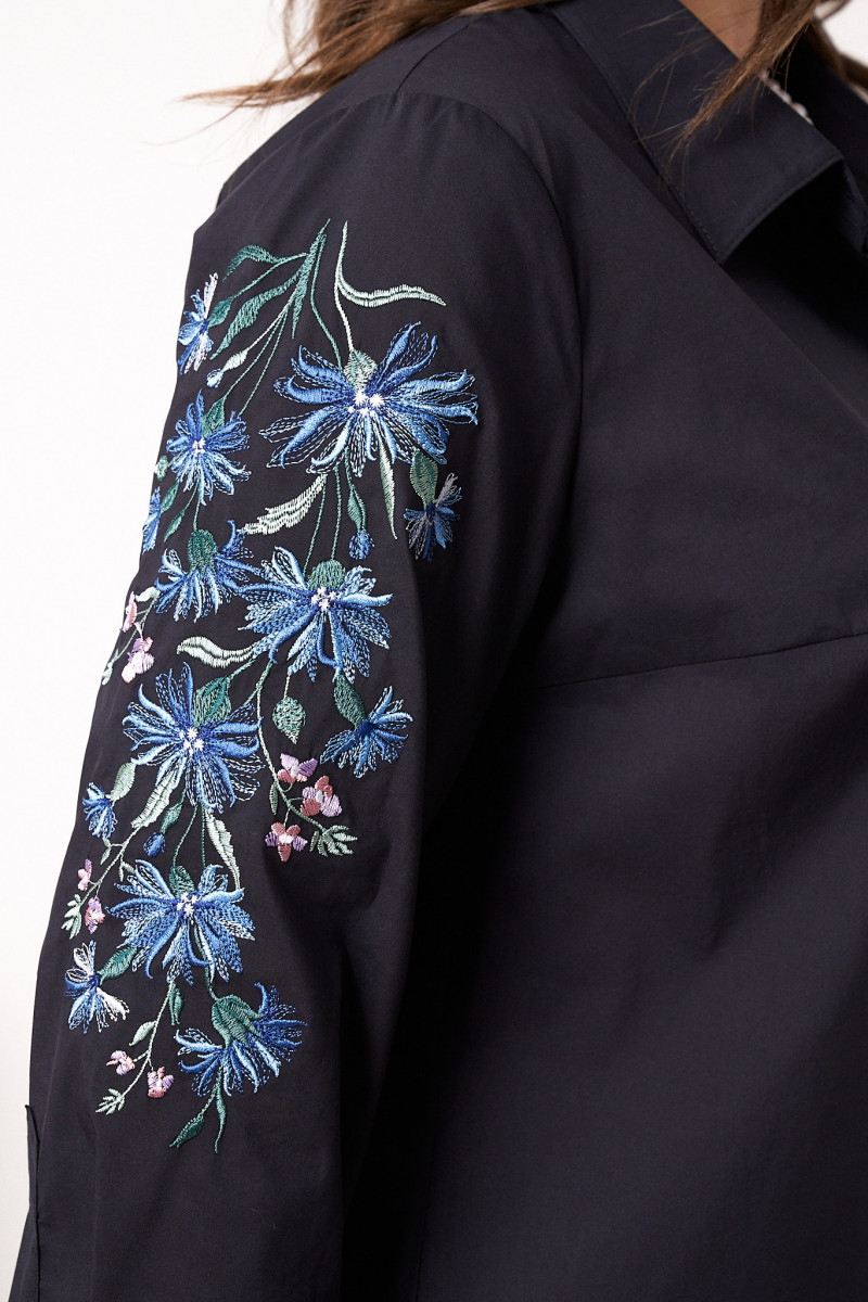 Блуза из смесовой ткани для повседневной носки прямого силуэта. Застежка в блузке супатная на петли и пуговицы. Перед имеет нагрудные вытачки, низ слегка скруглен. Спинка с кокеткой. Горловина обработана рубашечным воротником с отрезной стойкой. Рукава втачные с вышивкой в виде цветов, низ рукава обработан притачной манжетой с застежкой на две обметанные петли и две пуговицы. Длина изделия классическая. Элегантная и изысканная блузка станет вашим фаворитом для любого рода мероприятий.