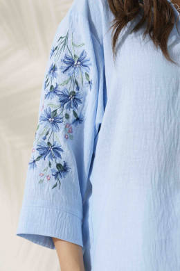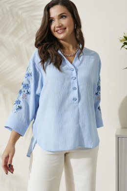 Блуза из смесовой ткани для повседневной носки. Блуза прямого силуэта с укороченным цельнокроеным рукавом оформленным притачной манжетой. По рукаву располагается дизайнерская вышивка. Горловина оформлена воротником стойкой. По спинке отрезная кокетка со встречной складкой. Длина изделия классическая. Приятная и милая блузка для разных прогулок и мероприятий.