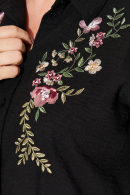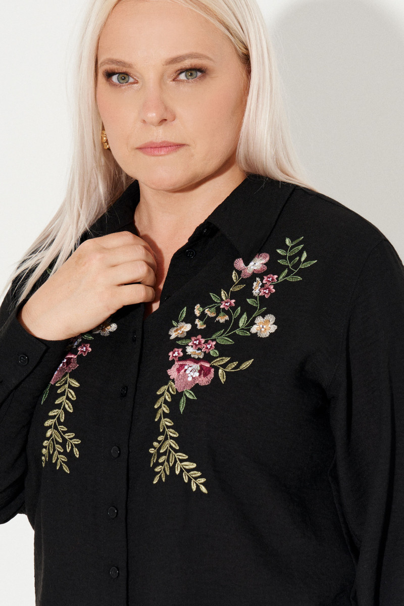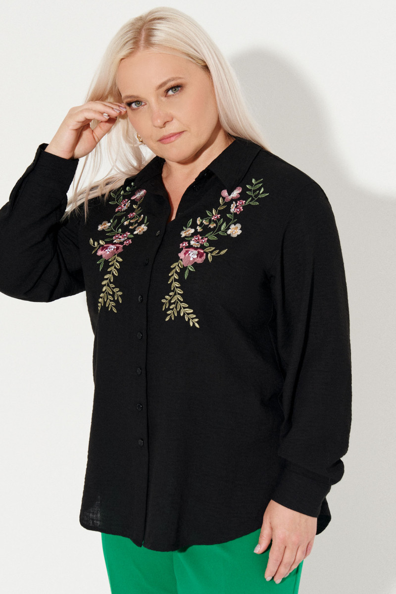 Блузка женская из хлопковой ткани для повседневной носки прямого силуэта. По переду имеется дизайнерская вышивка в виде цветов с центральной бортовой застежкой на десять обметанных петель и десять пуговиц. Спинка с кокеткой и двумя складками. В боковом шве по низу изделия имеются небольшие разрезы. Горловина обработана рубашечным воротником с отрезной стойкой. Низ рукава обработан притачной манжетой с застежкой на одну обметанную петлю и одну пуговицу. Длина изделия классическая.