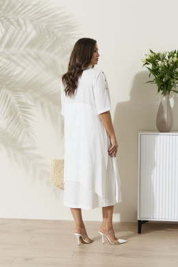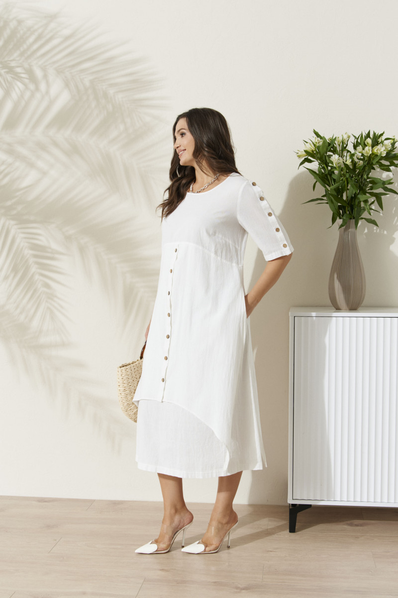 Платье женское из хлопчатобумажной ткани для повседневной носки. Платье расширенно к низу. Платье отрезное фигурной линией по лини талии. Лиф переда имеет две талиевые вытачки. Юбка платья двойная. Переднее полотнище юбки имеет планку с застежкой на обметанные петли и пуговицы, низ изделия фигурный. Заднее полотнище юбки имеет фигурный низ. В боковых швах имеются разрезы, а также в боковых швах располагаются прорезные карманы. Горловина расширенная. Рукава втачные, чуть ниже локтя. Вдоль рукава имеется застежка на обметанные петли и пуговицы Красивое платье с интересной конструкцией, которое станет отличным вариантом для вашего времяпровождения и будет отлично смотреться, и подчёркивать вашу фигуру.